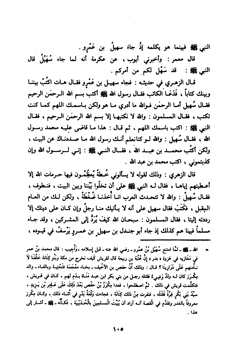 قَالَ الزُّهْرِيُّ فِي حَدِيثِهِ: فَجَاءَ سُهَيْلُ بْنُ عَمْرٍو فَقَالَ هَاتِ اكْتُبْ بَيْنَنَا وَبَيْنَكَ كِتَابًا، فَدَعَا الْكَاتِبَ فَقَالَ رَسُولُ اللهِ صَلَّى الله عليه وَسَلَّمَ اكْتُبْ بِسْمِ اللهِ الرَّحْمَنِ الرَّحِيمِ فقال سهيل أما الرحمن فو الله مَا أَدْرِي مَا هُوَ وَلَكِنْ بِاسْمِكَ اللهُمَّ كَمَا كُنْتَ تَكْتُبُ، فَقَالَ الْمُسْلِمُونَ: وَاللهِ لَا نَكْتُبُهَا إِلَّا بِسْمِ اللهِ الرَّحْمَنِ الرَّحِيمِ، فَقَالَ النَّبِيُّ صَلَّى اللهُ عَلَيْهِ وَسَلَّمَ: اكْتُبْ بِاسْمِكَ اللهُمَّ، ثُمَّ قَالَ: هَذَا مَا قَاضَى عَلَيْهِ مُحَمَّدٌ رَسُولُ اللهِ، فَقَالَ سُهَيْلٌ: وَاللهِ لَوْ كُنَّا نَعْلَمُ أَنَّكَ رَسُولُ اللهِ مَا صَدَدْنَاكَ عَنِ الْبَيْتِ، وَلَكِنِ اكْتُبْ مُحَمَّدُ بْنُ عَبْدِ اللهِ، فَقَالَ النَّبِيُّ صَلَّى اللهُ عَلَيْهِ وَسَلَّمَ: إِنِّي لَرَسُولُ اللهِ وَإِنْ كَذَّبْتُمُونِي، اكْتُبْ مُحَمَّدُ بْنُ عَبْدِ اللهِ.
