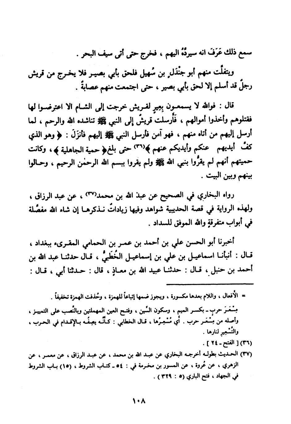 [ (37) ] الحديث بطوله أخرجه الْبُخَارِيُّ عَنْ عَبْدِ اللهِ بْنِ مُحَمَّدٍ، عَنْ عَبْدُ الرَّزَّاقِ، عَنْ مَعْمَرٍ، عَنِ الزُّهْرِيِّ، عَنْ عُرْوَةَ، عَنْ الْمِسْوَرِ بْنِ مَخْرَمَةَ في: 54- كتاب الشروط، (15) باب الشروط في الجهاد، فتح الباري (5: 329) .