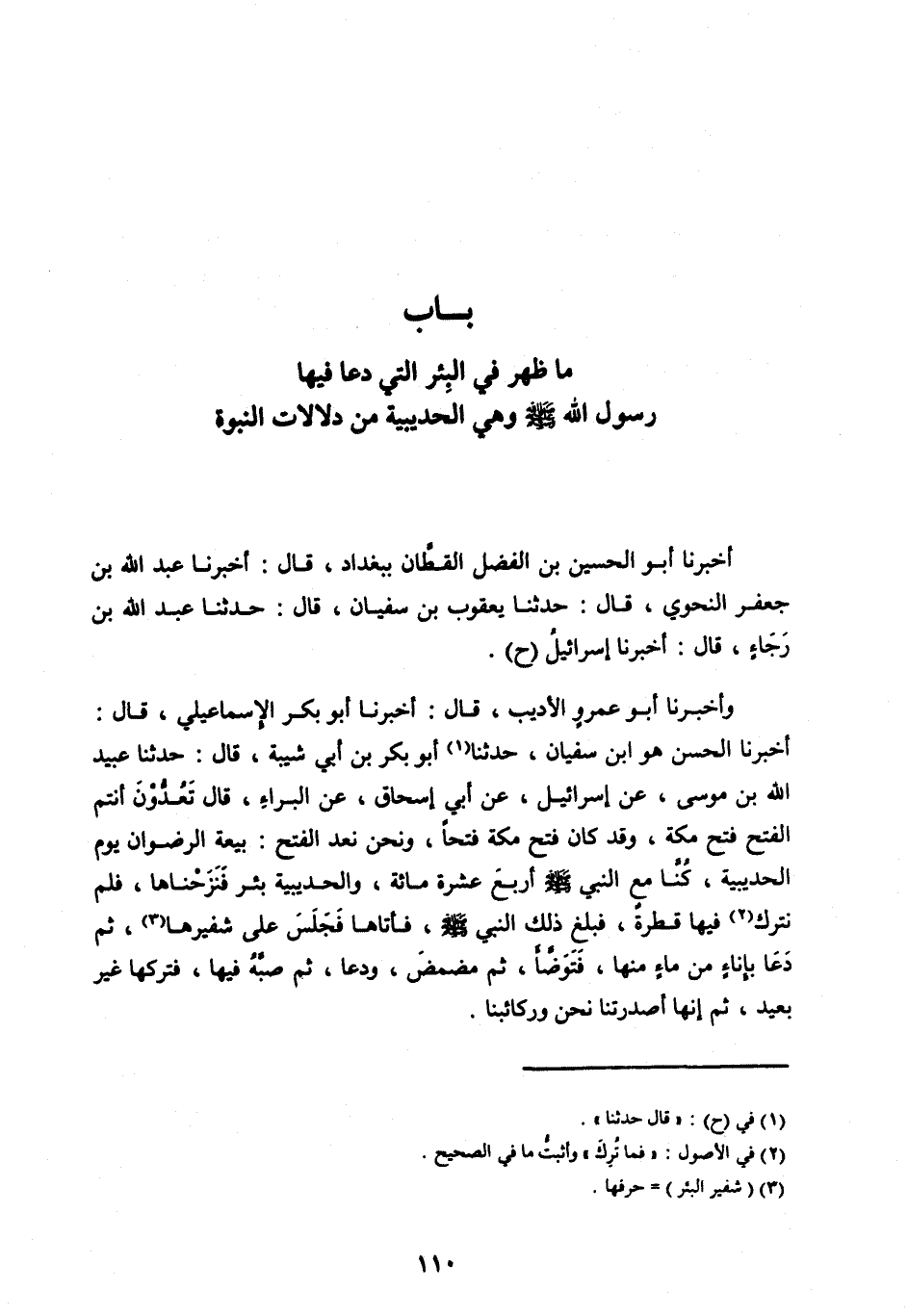 أَخْبَرَنَا الْحَسَنُ هُوَ ابْنُ سُفْيَانَ، حَدَّثَنَا [ (1) ] أَبُو بَكْرِ بْنُ أَبِي شَيْبَةَ، قَالَ: حَدَّثَنَا عُبَيْدُ اللهِ بْنُ مُوسَى، عَنْ إِسْرَائِيلَ، عَنْ أَبِي إِسْحَاقَ، عَنِ الْبَرَاءِ، قَالَ تَعُدُّونَ أَنْتُمُ الْفَتْحَ فَتْحَ مَكَّةَ، وَقَدْ كَانَ فَتْحُ مَكَّةَ فَتْحًا، وَنَحْنُ نَعُدُّ الْفَتْحَ: بَيْعَةَ الرِّضْوَانِ يَوْمَ الْحُدَيْبِيَةِ، كُنَّا مَعَ النَّبِيِّ صَلَّى اللهُ عليه وسلم أربع عَشْرَةَ مِائَةً، وَالْحُدَيْبِيَةُ بِئْرٌ فَنَزَحْنَاهَا، فَلَمْ نَتْرُكْ [ (2) ] فِيهَا قَطْرَةً، فَبَلَغَ ذَلِكَ النَّبِيَّ صَلَّى اللهُ عَلَيْهِ وَسَلَّمَ، فَأَتَاهَا فَجَلَسَ عَلَى شَفِيرِهَا [ (3) ] ، ثُمَّ دَعَا بِإِنَاءٍ مِنْ مَاءٍ مِنْهَا، فَتَوَضَّأَ، ثُمَّ مَضْمَضَ، وَدَعَا، ثُمَّ صَبَّهُ فِيهَا، فَتَرَكَهَا غَيْرَ بَعِيدٍ، ثُمَّ إِنَّهَا أَصْدَرَتْنَا نَحْنُ وركائبنا.