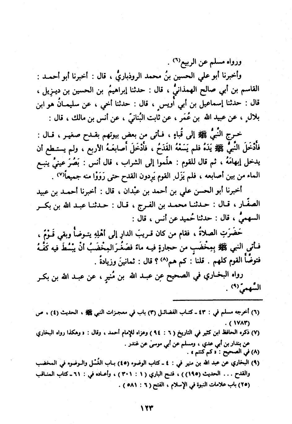 [ (9) ] الْبُخَارِيُّ عَنْ عَبْدِ اللهِ بن منير في: 4- كتاب الوضوء (45) باب الغسل والوضوء في المخضب والقدح ... الحديث (195) ، فتح الباري (1: 301) ، وأعاده في: 61- كتاب المناقب (25) باب علامات النبوة في الإسلام، الْفَتْحِ (6: 581) .