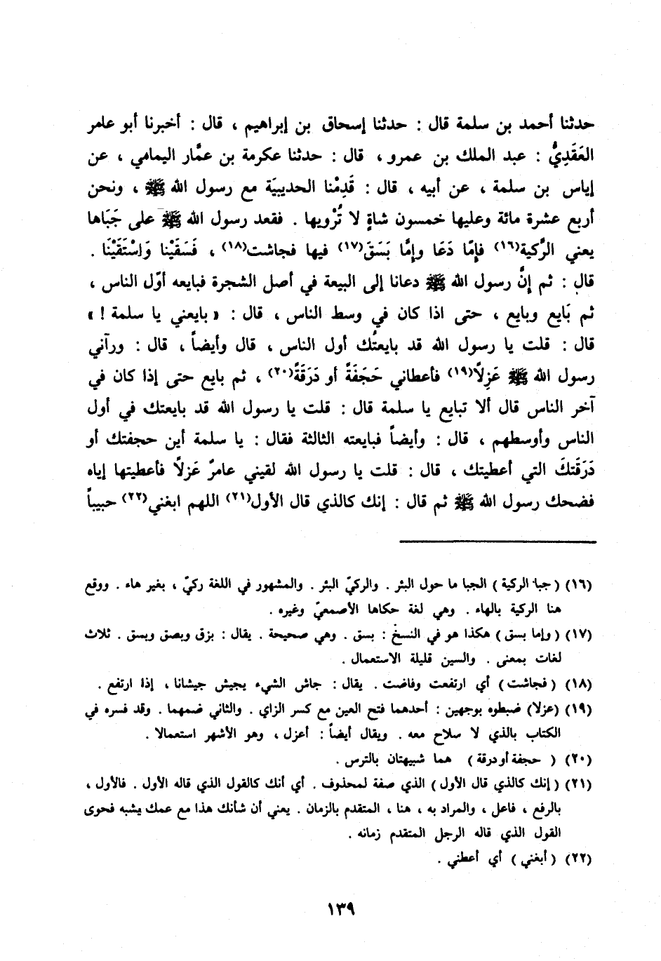قَالَ: ثُمَّ إِنَّ رَسُولَ اللهِ صَلَّى اللهُ عَلَيْهِ وَسَلَّمَ دَعَانَا إِلَى الْبَيْعَةِ فِي أَصْلِ الشَّجَرَةِ فَبَايَعَهُ أَوَّلُ النَّاسِ، ثُمَّ بَايَعَ وَبَايَعَ، حَتَّى إِذَا كَانَ فِي وَسَطِ النَّاسِ، قَالَ: «بَايِعْنِي يَا سَلَمَةُ!» قَالَ: قُلْتُ يَا رَسُولَ الله قَدْ بَايَعْتُكَ أَوَّلَ النَّاسِ، قَالَ وَأَيْضًا، قَالَ: وَرَآنِي رسول الله صلى الله عَلَيْهِ وَسَلَّمَ عَزِلًا [ (19) ] فَأَعْطَانِي حَجَفَةً أَوْ دَرَقَةً [ (20) ] ، ثُمَّ بَايَعَ حَتَّى إِذَا كَانَ فِي آخِرِ النَّاسِ قَالَ أَلَا تُبَايِعُ يَا سَلَمَةُ قَالَ: قُلْتُ يَا رَسُولَ اللهِ قَدْ بَايَعْتُكَ فِي أَوَّلِ النَّاسِ وَأَوْسَطِهِمْ، قَالَ: وَأَيْضًا فَبَايَعْتُهُ الثَّالِثَةَ فَقَالَ: يَا سَلَمَةُ أَيْنَ حَجَفَتُكَ أَوْ دَرَقَتُكَ الَّتِي أَعْطَيْتُكَ، قَالَ: قُلْتُ يَا رَسُولَ اللهِ لَقِيَنِي عَامِرٌ عَزِلًا فَأَعْطَيْتُهَا إِيَّاهُ فَضَحِكَ رَسُولُ اللهِ صَلَّى اللهُ عَلَيْهِ وَسَلَّمَ ثُمَّ قَالَ: إِنَّكَ كَالَّذِي قَالَ الْأَوَّلُ [ (21) ] اللهُمَّ ابغني [ (22) ] حبيبا
