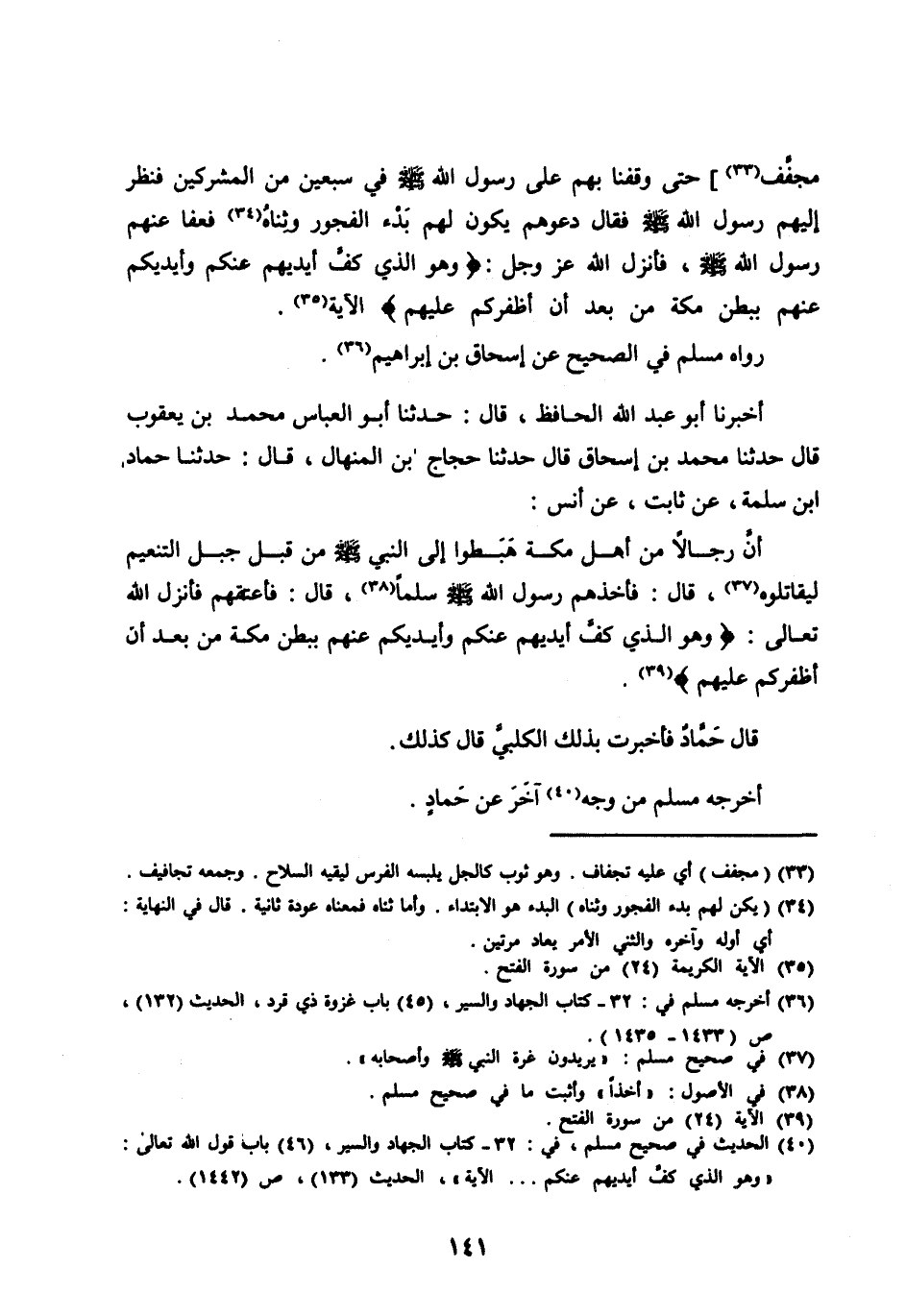 مُجَفَّفٍ [ (33) ]] حَتَّى وَقَفْنَا بِهِمْ عَلَى رَسُولِ اللهِ صلى اللهُ عَلَيْهِ وَسَلَّمَ فِي سَبْعِينَ مِنَ الْمُشْرِكِينَ فَنَظَرَ إِلَيْهِمْ رَسُولُ اللهِ صَلَّى اللهُ عَلَيْهِ وَسَلَّمَ فَقَالَ دَعُوهُمْ يَكُونُ لَهُمْ بَدْءُ الْفُجُورِ وَثِنَاهُ [ (34) ] فَعَفَا عَنْهُمْ رَسُولُ اللهِ صَلَّى اللهُ عَلَيْهِ وَسَلَّمَ، فَأَنْزَلَ اللهُ عَزَّ وَجَلَّ: وَهُوَ الَّذِي كَفَّ أَيْدِيَهُمْ عَنْكُمْ وَأَيْدِيَكُمْ عَنْهُمْ بِبَطْنِ مَكَّةَ مِنْ بَعْدِ أَنْ أَظْفَرَكُمْ عَلَيْهِمْ الْآيَةَ [ (35) ] .