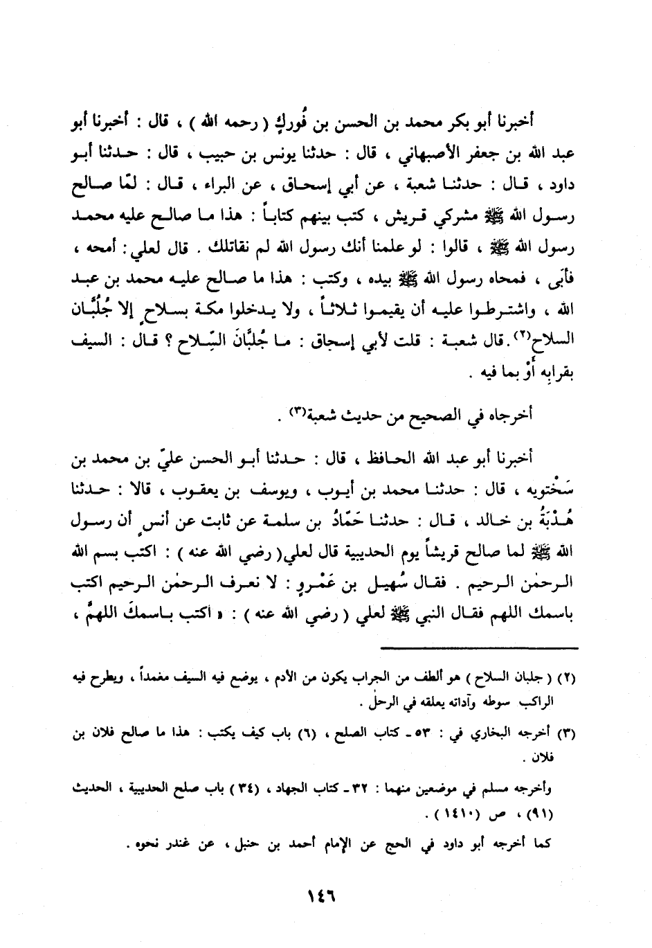 أَخْبَرَنَا أَبُو بَكْرٍ مُحَمَّدُ بْنُ الْحَسَنِ بْنِ فُورَكٍ (رَحِمَهُ اللهُ) ، قَالَ: أَخْبَرَنَا أَبُو عَبْدِ اللهِ بْنُ جَعْفَرٍ الْأَصْبَهَانِيُّ، قَالَ: حَدَّثَنَا يُونُسُ بْنُ حَبِيبٍ، قَالَ: حَدَّثَنَا أَبُو دَاوُدَ، قَالَ: حَدَّثَنَا شُعْبَةُ، عَنْ أَبِي إِسْحَاقَ، عَنِ الْبَرَاءِ، قَالَ: لَمَّا صَالَحَ رَسُولُ اللهِ صَلَّى اللهُ عليه وسلم مُشْرِكِي قُرَيْشٍ، كَتَبَ بَيْنَهُمْ كِتَابًا: هَذَا مَا صَالَحَ عَلَيْهِ مُحَمَّدٌ رَسُولُ اللهِ صَلَّى اللهُ عَلَيْهِ وَسَلَّمَ، قَالُوا: لَوْ عَلِمْنَا أَنَّكَ رَسُولُ اللهِ لَمْ نُقَاتِلْكَ. قَالَ لِعَلِيٍّ: امْحُهُ، فَأَبَى، فَمَحَاهُ رَسُولُ اللهِ صَلَّى اللهُ عَلَيْهِ وَسَلَّمَ بِيَدِهِ، وَكَتَبَ: هَذَا مَا صَالَحَ عَلَيْهِ مُحَمَّدُ بْنُ عَبْدِ اللهِ، وَاشْتَرَطُوا عَلَيْهِ أَنْ يُقِيمُوا ثَلَاثًا، وَلَا يَدْخُلُوا مَكَّةَ بِسِلَاحٍ إِلَّا جُلُبَّانَ السِّلَاحِ [ (2) ] . قَالَ شُعْبَةُ: قُلْتُ لِأَبِي إِسْحَاقَ: مَا جُلُبَّانُ السِّلَاحِ؟ قَالَ: السَّيْفُ بِقِرَابِهِ أَوْ بِمَا فِيهِ.