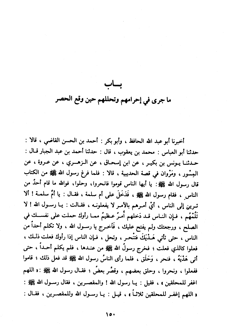 حَدَّثَنَا يُونُسُ بْنُ بُكَيْرٍ، عَنِ ابْنِ إِسْحَاقَ، عَنِ الزُّهْرِيِّ، عَنْ عُرْوَةَ، عَنِ الْمِسْوَرِ، وَمَرْوَانَ فِي قِصَّةِ الْحُدَيْبِيَةِ، قَالَا: فَلَمَّا فَرَغَ رَسُولُ اللهِ صَلَّى اللهُ عَلَيْهِ وسلم مِنَ الْكِتَابِ قَالَ رَسُولُ اللهِ صَلَّى اللهُ عَلَيْهِ وَسَلَّمَ: يَا أَيُّهَا النَّاسُ قوموا فانحروا، وحلوا، فو الله مَا قَامَ أَحَدٌ مِنَ النَّاسِ، فَقَامَ رَسُولُ اللهِ صَلَّى الله عليه وسلم، فَدَخَلَ عَلَى أُمِّ سَلَمَةَ، فَقَالَ: يَا أُمَّ سَلَمَةَ! أَلَا تَرَيْنَ إِلَى النَّاسِ، أَيْ آمُرُهُمْ بِالْأَمْرِ لَا يَفْعَلُونَهُ، فَقَالَتْ: يَا رَسُولَ اللهِ! لَا تَلُمْهُمْ، فَإِنَّ النَّاسَ قَدْ دَخَلَهُمْ أَمْرٌ عَظِيمٌ مِمَّا رَأَوْكَ حَمَلْتَ عَلَى نَفْسِكَ فِي الصُّلْحِ، وَرَجْعَتِكَ وَلَمْ يُفْتَحْ عَلَيْكَ، فَاخْرُجْ يَا رَسُولَ اللهِ، وَلَا تُكَلِّمْ أَحَدًا مِنَ النَّاسِ، حَتَّى تَأْتِيَ هَدْيَكَ فَتَنْحَرَ، وَتَحُلَّ، فَإِنَّ النَّاسَ إِذَا رَأَوْكَ فَعَلْتَ ذَلِكَ، فَعَلُوا كَالَّذِي فَعَلْتَ، فَخَرَجَ رَسُولُ اللهِ صَلَّى اللهُ عَلَيْهِ وَسَلَّمَ مِنْ عِنْدَهَا، فَلَمْ يُكَلِّمْ أَحَدًا، حَتَّى أَتَى هَدْيَهُ، فَنَحَرَ، وَحَلَقَ، فَلَمَّا رَأَى النَّاسُ رَسُولَ اللهِ صَلَّى اللهُ عليه وَسَلَّمَ قَدْ فَعَلَ ذَلِكَ، قَامُوا فَفَعَلُوا، وَنَحَرُوا، وَحَلَقَ بَعْضُهُمْ، وَقَصَّرَ بَعْضٌ، فَقَالَ رَسُولُ اللهِ صَلَّى اللهُ عَلَيْهِ وَسَلَّمَ: «اللهُمَّ اغْفِرْ لِلْمُحَلِّقِينَ» ، فَقِيلَ: يَا رَسُولَ اللهِ! وَالْمُقَصِّرِينَ، فَقَالَ رَسُولُ اللهِ صَلَّى اللهُ عَلَيْهِ وَسَلَّمَ: