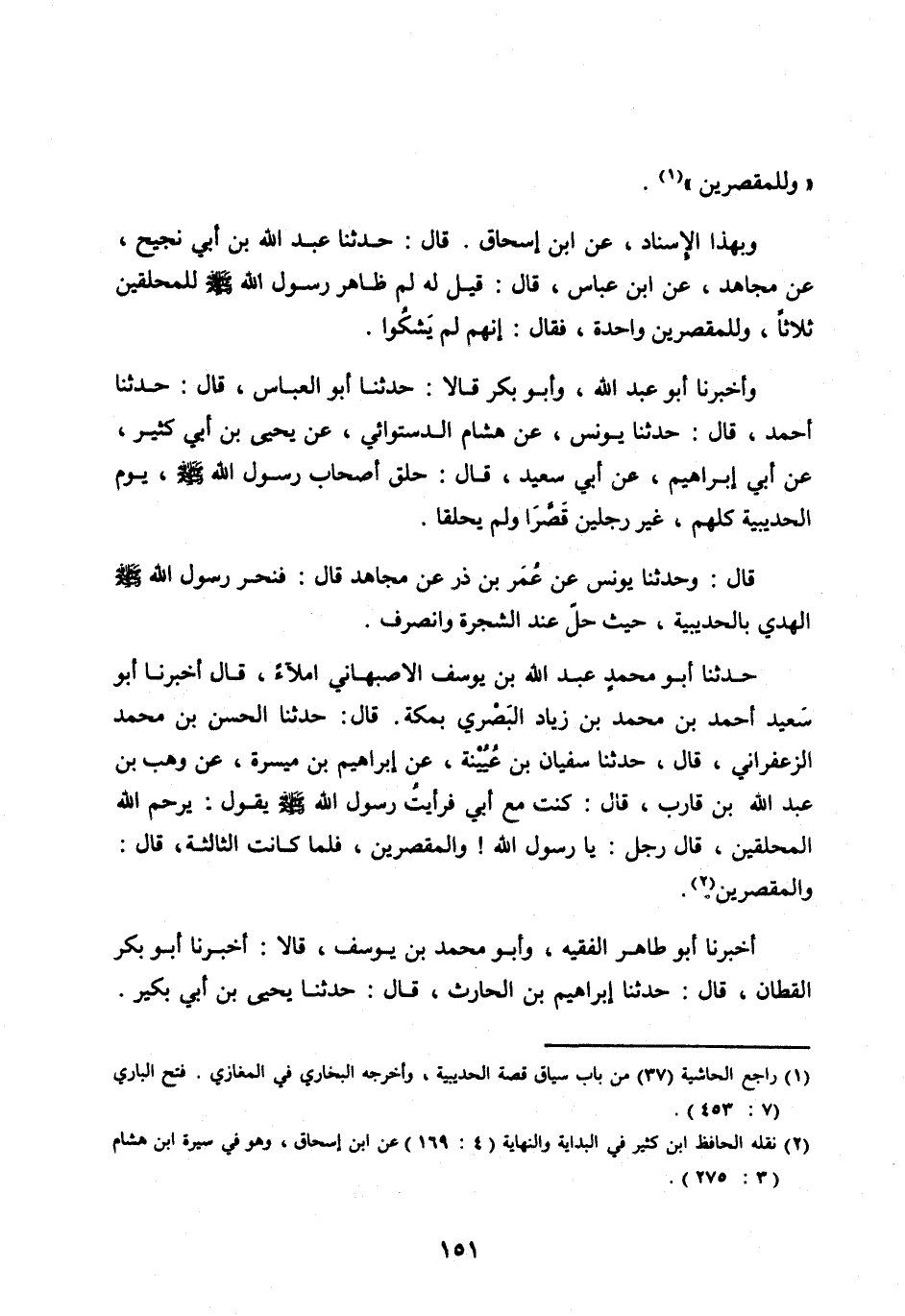 وَبِهَذَا الْإِسْنَادِ، عَنِ ابْنِ إِسْحَاقَ. قَالَ: حَدَّثَنَا عَبْدُ اللهِ بْنِ أَبِي نَجِيحٍ، عَنْ مُجَاهِدٍ، عَنِ ابْنِ عَبَّاسٍ، قَالَ: قِيلَ لَهُ لِمَ ظَاهَرَ رَسُولُ الله صلى الله عليه وَسَلَّمَ لِلْمُحَلِّقِينَ ثَلَاثًا، وَلِلْمُقَصِّرِينَ وَاحِدَةً، فَقَالَ: إِنَّهُمْ لَمْ يَشْكُوا.