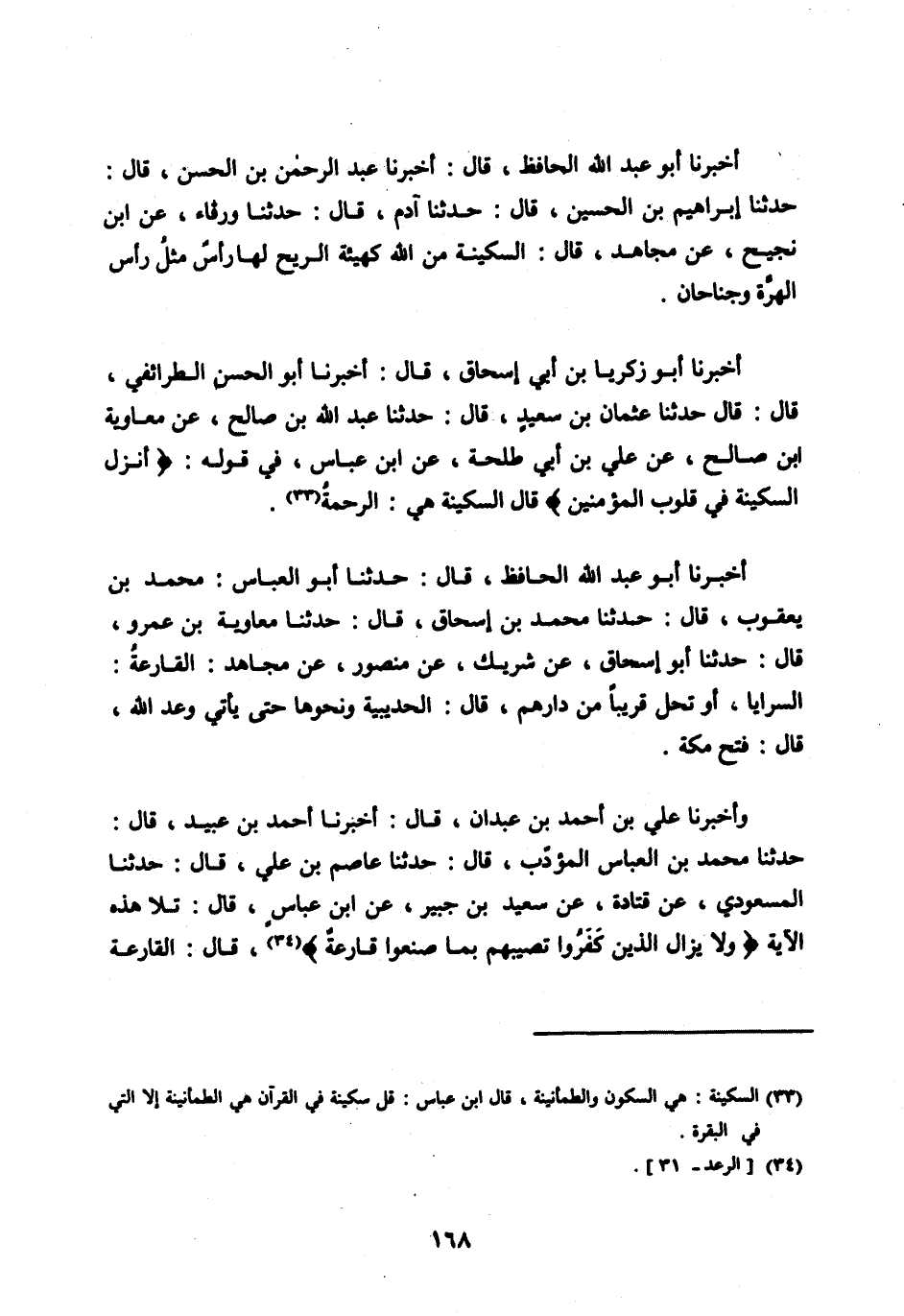 أَخْبَرَنَا أَبُو زَكَرِيَّا بْنُ أَبِي إِسْحَاقَ، قَالَ: أَخْبَرَنَا أَبُو الْحَسَنِ الطَّرَائِفِيُّ، قَالَ: قَالَ حَدَّثَنَا عُثْمَانُ بْنُ سَعِيدٍ، قَالَ: حَدَّثَنَا عَبْدُ اللهِ بْنُ صَالِحٍ، عَنْ مُعَاوِيَةَ ابن صَالِحٍ، عَنْ عَلِيِّ بْنِ أَبِي طَلْحَةَ، عَنِ ابْنِ عَبَّاسٍ، فِي قَوْلِهِ: أَنْزَلَ السَّكِينَةَ فِي قُلُوبِ الْمُؤْمِنِينَ قَالَ السَّكِينَةُ هِيَ: الرَّحْمَةُ [ (33) ] .