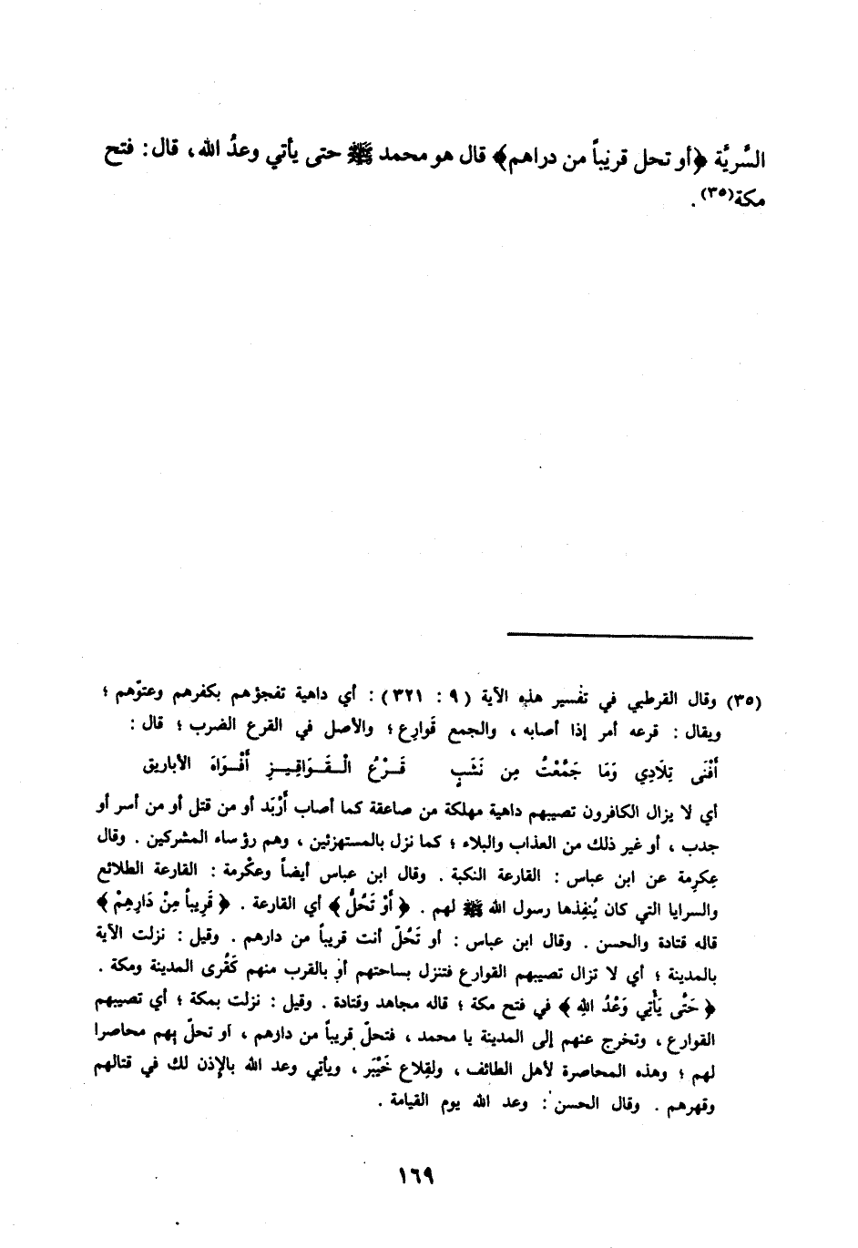 السَّرِيَّةُ أَوْ تَحُلُّ قَرِيباً مِنْ دارِهِمْ قَالَ هُوَ مُحَمَّدٌ صَلَّى اللهُ عَلَيْهِ وَسَلَّمَ حَتَّى يَأْتِيَ وَعْدُ اللهِ، قال: فتح مكة [ (35) ] .