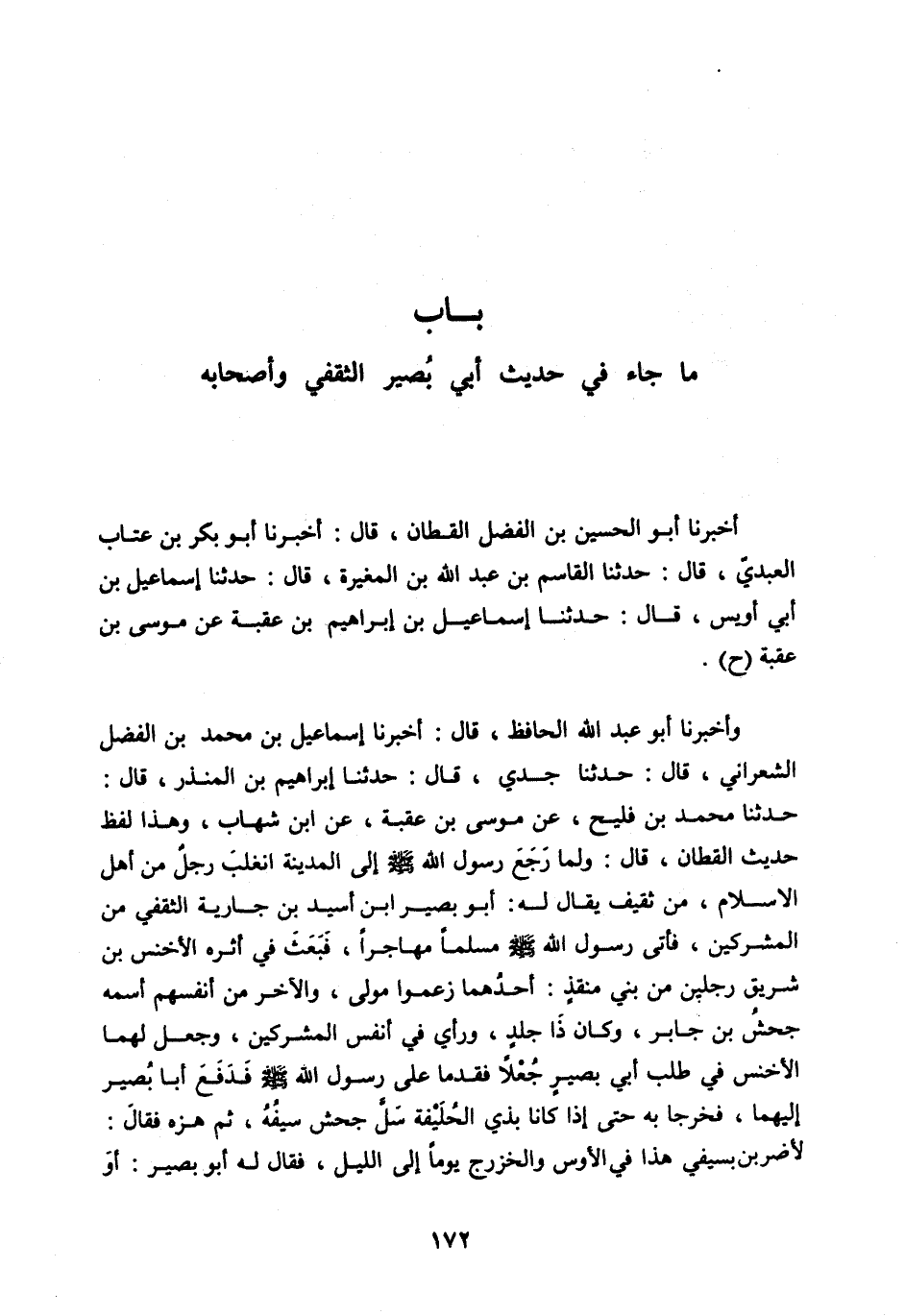 حَدَّثَنَا مُحَمَّدُ بْنُ فُلَيْحٍ، عَنْ مُوسَى بْنِ عُقْبَةَ، عَنِ ابْنِ شِهَابٍ، وَهَذَا لَفْظُ حَدِيثِ الْقَطَّانِ، قَالَ: ولَمَّا رَجَعَ رَسُولُ اللهِ صَلَّى اللهُ عَلَيْهِ وَسَلَّمَ إِلَى الْمَدِينَةِ انْغَلَبَ رَجُلٌ مِنْ أَهْلِ الْإِسْلَامِ، مِنْ ثَقِيفٍ يُقَالُ له: أبو بصير ابن أُسَيْدِ بْنِ جَارِيَةَ الثَّقَفِيُّ مِنَ الْمُشْرِكِينَ، فَأَتَى رَسُولَ الله صلى الله عليه وَسَلَّمَ مُسْلِمًا مُهَاجِرًا، فَبَعَثَ فِي أَثَرِهِ الْأَخْنَسُ بْنُ شَرِيقٍ رَجُلَيْنِ مِنْ بَنِي مُنْقِذٍ: أَحَدُهُمَا زَعَمُوا مَوْلًى، وَالْآخَرُ مِنْ أَنْفُسِهِمُ اسْمُهُ جَحْشُ بْنُ جَابِرٍ، وَكَانَ ذَا جَلَدٍ، وَرَأْيٍ فِي أَنْفُسِ الْمُشْرِكِينَ، وَجَعَلَ لَهُمَا الْأَخْنَسُ فِي طَلَبِ أَبِي بَصِيرٍ جُعْلًا فَقَدِمَا عَلَى رَسُولِ اللهِ صَلَّى اللهُ عَلَيْهِ وَسَلَّمَ فَدَفَعَ أَبَا بَصِيرٍ إِلَيْهِمَا، فَخَرَجَا بِهِ حَتَّى إِذَا كَانَا بِذِي الْحُلَيْفَةِ سَلَّ جَحْشٌ سَيْفَهُ، ثُمَّ هَزَّهُ فَقَالَ: