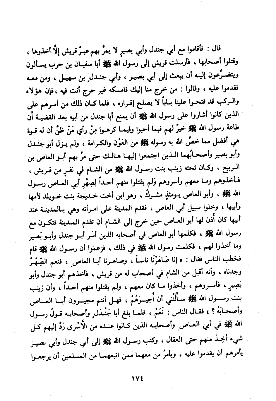 قَالَ: فَأَقَامُوا مَعَ أَبِي جَنْدَلِ وَأَبِي بَصِيرٍ لَا يَمُرُّ بِهِمْ عِيرُ قُرَيْشٍ إِلَّا أَخَذُوهَا، وَقَتَلُوا أَصْحَابَهَا، فَأَرْسَلَتْ قُرَيْشٌ إِلَى رَسُولِ اللهِ صَلَّى اللهُ عَلَيْهِ وَسَلَّمَ أَبَا سُفْيَانَ بْنَ حَرْبٍ يَسْأَلُونَ وَيَتَضَرَّعُونَ إِلَيْهِ أَنْ يَبْعَثَ إِلَى أَبِي بَصِيرٍ، وَأَبِي جَنْدَلِ بْنِ سُهَيْلٍ، وَمَنْ مَعَهُ فَقَدِمُوا عَلَيْهِ، وَقَالُوا: مَنْ خَرَجَ مِنَّا إِلَيْكَ فَأَمْسِكْهُ غَيْرَ حَرِجٍ أَنْتَ فِيهِ، فَإِنَّ هَؤُلَاءِ وَالرَّكْبَ قَدْ فَتَحُوا عَلَيْنَا بَابًا لَا يَصْلُحُ إِقْرَارُهُ، فَلَمَّا كَانَ ذَلِكَ مِنْ أَمْرِهِمْ عَلَى الَّذِينَ كَانُوا أَشَارُوا عَلَى رَسُولِ اللهِ صَلَّى اللهُ عليه وَسَلَّمَ أَنْ يَمْنَعَ أَبَا جَنْدَلٍ مِنْ أَبِيهِ بَعْدَ الْقَضِيَّةِ أَنَّ طَاعَةَ رَسُولِ اللهِ صَلَّى اللهُ عليه وَسَلَّمَ خَيْرٌ لَهُمْ فِيمَا أَحَبُّوا وَفِيمَا كَرِهُوا مِنْ رَأْيِ مَنْ ظَنَّ أَنَّ لَهُ قُوَّةً هِيَ أَفْضَلُ مِمَّا خَصَّ اللهُ بِهِ رَسُولَهُ صَلَّى اللهُ عليه وَسَلَّمَ مِنَ الْعَوْنِ وَالْكَرَامَةِ، وَلَمْ يَزَلْ أَبُو جَنْدَلٍ وَأَبُو بَصِيرٍ وَأَصْحَابُهُمَا الَّذِينَ اجْتَمَعُوا إِلَيْهَا هُنَالِكَ حَتَّى مَرَّ بِهِمْ أَبُو الْعَاصِ بْنُ الرَّبِيعِ، وَكَانَ تَحْتَهُ زَيْنَبُ بِنْتُ رَسُولِ اللهِ صَلَّى اللهُ عَلَيْهِ وسلم مِنَ الشَّامِ فِي نَفَرٍ مِنْ قُرَيْشٍ، فَأَخَذُوهُمْ وَمَا مَعَهُمْ وَأَسَرُوهُمْ وَلَمْ يَقْتُلُوا مِنْهُمْ أَحَدًا لِصِهْرِ أَبِي الْعَاصِ رَسُولَ اللهِ صَلَّى اللهُ عَلَيْهِ وَسَلَّمَ، وَأَبُو الْعَاصِ يَوْمَئِذٍ مُشْرِكٌ، وَهُوَ ابْنُ أُخْتِ خَدِيجَةَ بِنْتِ خُوَيْلِدٍ لِأُمِّهَا وَأَبِيهَا، وَخَلَّوْا سَبِيلَ أَبِي الْعَاصِ، فَقَدِمَ الْمَدِينَةَ عَلَى امْرَأَتِهِ وَهِيَ بِالْمَدِينَةِ عِنْدَ أَبِيهَا كَانَ أَذِنَ لَهَا أَبُو الْعَاصِ حِينَ خَرَجَ إِلَى الشَّامِ أَنْ تَقْدَمَ الْمَدِينَةَ فَتَكُونَ مَعَ رَسُولِ اللهِ صَلَّى اللهُ عَلَيْهِ وَسَلَّمَ، فَكَلَّمَهَا أَبُو الْعَاصِ فِي أَصْحَابِهِ الَّذِينَ أَسَرَ أَبُو جَنْدَلٍ وَأَبُو بَصِيرٍ وَمَا أَخَذُوا لَهُمْ، فَكَلَّمَتْ رَسُولَ اللهِ صَلَّى اللهُ عَلَيْهِ وَسَلَّمَ فِي ذَلِكَ،