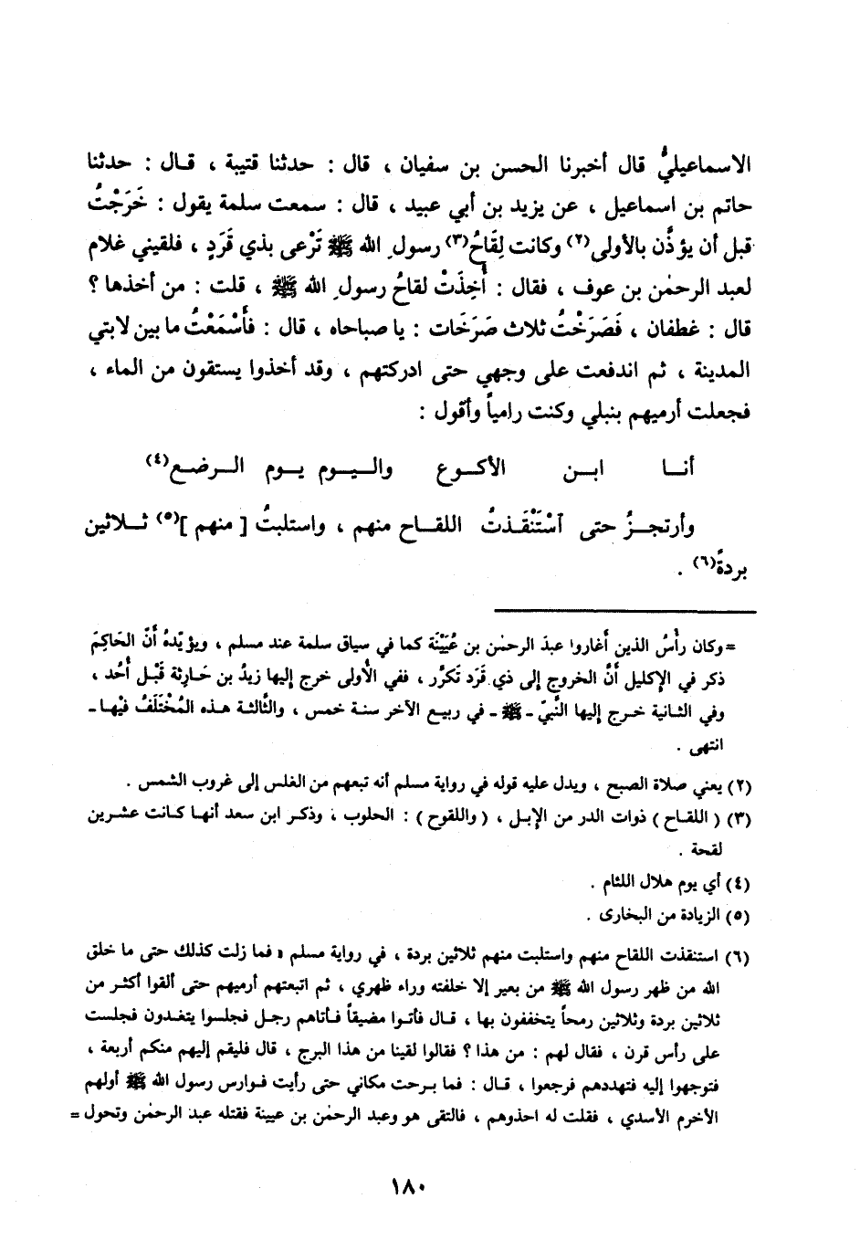 الْإِسْمَاعِيلِيُّ قَالَ أَخْبَرَنَا الْحَسَنُ بْنُ سُفْيَانَ، قَالَ: حَدَّثَنَا قُتَيْبَةُ، قَالَ: حَدَّثَنَا حَاتِمُ بْنُ إِسْمَاعِيلَ، عَنْ يَزِيدَ بْنِ أَبِي عُبَيْدٍ، قَالَ: سَمِعْتُ سَلَمَةَ يَقُولُ: خَرَجْتُ قَبْلَ أَنْ يؤَذَّنَ بِالْأُولَى [ (2) ] وَكَانَتْ لِقَاحُ [ (3) ] رَسُولِ اللهِ صلى الله عليه وسلم تَرْعَى بِذِي قَرَدٍ، فَلَقِيَنِي غُلَامٌ لِعَبْدِ الرَّحْمَنِ بْنِ عَوْفٍ، فَقَالَ: أُخِذَتْ لِقَاحُ رَسُولِ اللهِ صلى الله عَلَيْهِ وَسَلَّمَ، قُلْتُ: مَنْ أَخَذَهَا؟