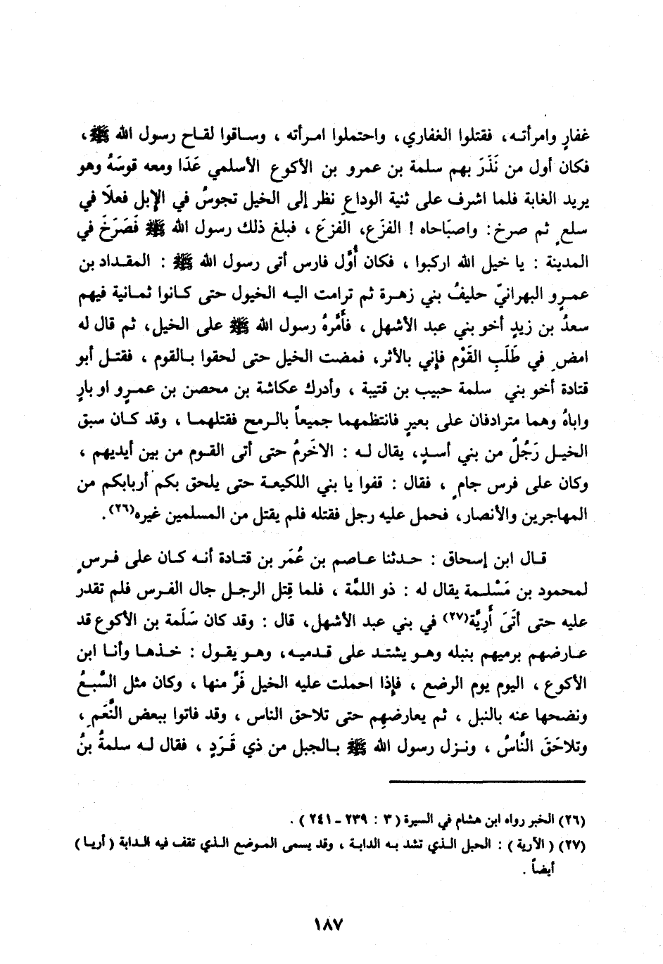 قَالَ ابْنُ إِسْحَاقَ: حَدَّثَنَا عَاصِمُ بْنُ عُمَرَ بْنِ قَتَادَةَ أَنَّهُ كَانَ عَلَى فَرَسٍ لِمَحْمُودِ بْنِ مَسْلَمَةَ يُقَالُ لَهُ: ذُو اللِّمَّةِ، فَلَمَّا قُتِلَ الرَّجُلُ جَالَ الْفَرَسُ فَلَمْ تقدر عَلَيْهِ حَتَّى أَتَى أَرِيَّةً [ (27) ] فِي بَنِي عَبْدِ الْأَشْهَلِ، قَالَ: وَقَدْ كَانَ سَلَمَةُ بْنُ الْأَكْوَعِ قَدْ عَارَضَهُمْ بِرَمْيِهِمْ بِنَبْلِهِ وَهُوَ يَشْتَدُّ عَلَى قَدَمَيْهِ، وَهُوَ يَقُولُ: خُذْهَا وَأَنَا ابْنُ الْأَكْوَعِ، الْيَوْمُ يَوْمُ الرُّضَّعِ، فَإِذَا أُحْمِلَتْ عَلَيْهِ الْخَيْلُ فَرَّ مِنْهَا، وَكَانَ مِثْلَ السَّبْعِ وَنَضَحَهَا عَنْهُ بِالنَّبْلِ، ثُمَّ يُعَارِضُهُمْ حَتَّى تَلَاحَقَ النَّاسُ، وَقَدْ فَاتُوا بِبَعْضِ النَّعَمِ، وَتَلَاحَقَ النَّاسُ،