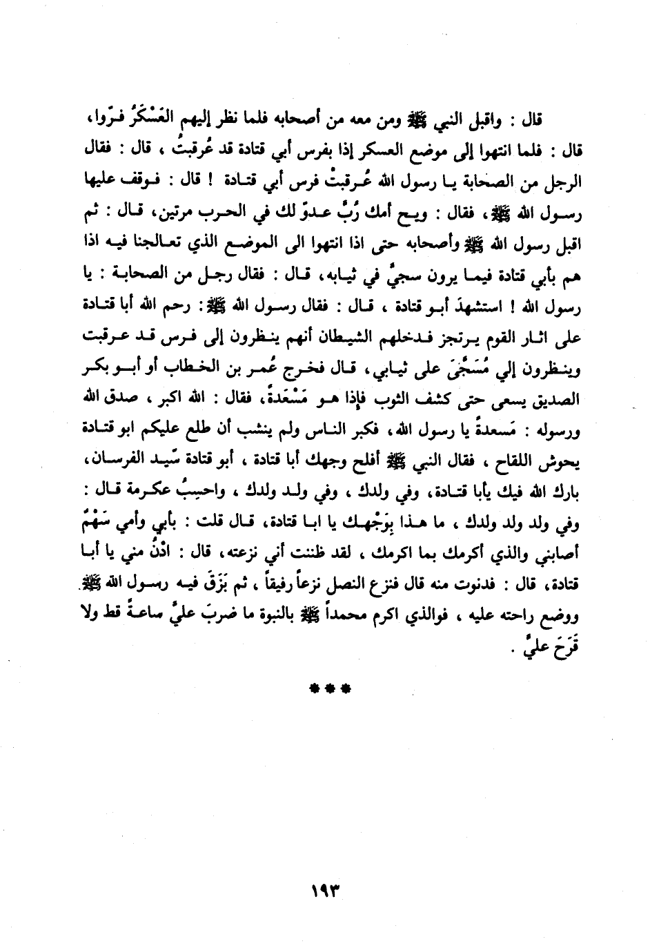 قَالَ: وَأَقْبَلَ النَّبِيُّ صَلَّى الله عليه وسلم ومن مَعَهُ مِنْ أَصْحَابِهِ فَلَمَّا نَظَرَ إِلَيْهِمُ الْعَسْكَرُ فَرُّوا، قَالَ: فَلَمَّا انْتَهَوْا إِلَى مَوْضِعِ الْعَسْكَرِ إِذَا بِفَرَسِ أَبِي قَتَادَةَ قَدْ عُرْقِبَتْ، قَالَ: فقال الرجل مِنَ الصَّحَابَةِ يَا رَسُولَ اللهِ عُرْقِبَتْ فَرَسُ أَبِي قَتَادَةَ! قَالَ: فَوَقَفَ عَلَيْهَا رَسُولُ اللهِ صَلَّى اللهُ عَلَيْهِ وَسَلَّمَ، فَقَالَ: وَيْحُ أُمِّكَ رُبَّ عَدُوٍّ لَكَ فِي الْحَرْبِ مَرَّتَيْنِ، قَالَ: ثُمَّ أَقْبَلَ رَسُولُ اللهِ صَلَّى اللهُ عَلَيْهِ وَسَلَّمَ وَأَصْحَابُهُ حَتَّى إِذَا انْتَهَوْا إِلَى الْمَوْضِعِ الَّذِي تَعَالَجْنَا فِيهِ إِذَا هُمْ بِأَبِي قَتَادَةَ فِيمَا يَرَوْنَ سُجِّيَ فِي ثِيَابِهِ، قَالَ: فَقَالَ رَجُلٌ مِنَ الصَّحَابَةِ: يَا رَسُولَ اللهِ! اسْتُشْهِدَ أَبُو قَتَادَةَ، قَالَ: فَقَالَ رَسُولُ اللهِ صَلَّى اللهُ عَلَيْهِ وَسَلَّمَ: رَحِمَ اللهُ أَبَا قَتَادَةَ عَلَى آثَارِ الْقَوْمِ يَرْتَجِزُ فَدَخَلَهُمُ الشَّيْطَانُ أَنَّهُمْ يَنْظُرُونَ إِلَى فَرَسٍ قَدْ عُرْقِبَتْ وَيَنْظُرُونَ إِلَيَّ مُسَجًّى عَلَى ثِيَابِي، قَالَ فَخَرَجَ عُمَرُ بْنُ الْخَطَّابِ أَوْ أَبُو بَكْرٍ الصِّدِّيقُ يَسْعَى حَتَّى كَشَفَ الثَّوْبَ فَإِذَا هُوَ مَسْعَدَةُ، فَقَالَ: اللهُ أَكْبَرُ، صَدَقَ اللهُ وَرَسُولُهُ: مَسْعَدَةُ يَا رَسُولَ اللهِ، فَكَبَّرَ النَّاسُ وَلَمْ يَنْشِبْ أن طلع عليكم أَبُو قَتَادَةَ يَحُوشُ اللِّقَاحَ، فَقَالَ النَّبِيُّ صَلَّى اللهُ عَلَيْهِ وَسَلَّمَ أَفْلَحَ وَجْهُكَ أَبَا قَتَادَةَ، أَبُو قَتَادَةَ سَيِّدُ الْفُرْسَانِ، بَارَكَ اللهُ فِيكَ يَا أَبَا قَتَادَةَ، وَفِي وَلَدِكَ، وَفِي وَلَدِ وَلَدِكَ، وَأَحْسَبُ عِكْرِمَةَ قَالَ: