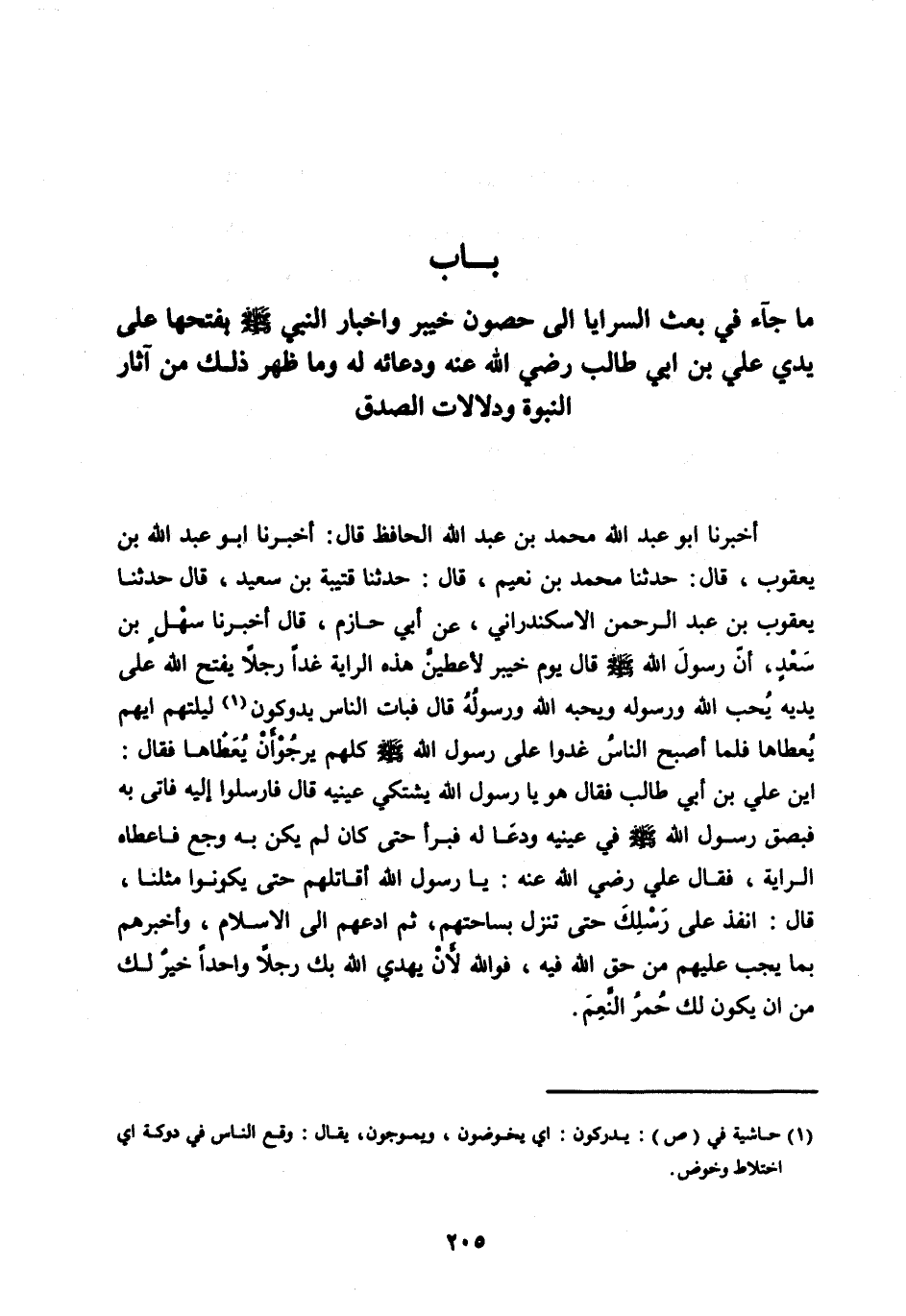 بَابُ مَا جَاءَ فِي بَعْثِ السَّرَايَا إِلَى حُصُونِ خَيْبَرَ وَإِخْبَارِ النَّبِيِّ صَلَّى اللهُ عَلَيْهِ وَسَلَّمَ بَفَتْحِهَا عَلَى يَدَيْ عَلِيِّ بْنِ أَبِي طَالِبٍ رَضِيَ اللهُ عَنْهُ وَدُعَائِهِ لَهُ وَمَا ظَهَرَ ذَلِكَ مِنْ آثَارِ النُّبُوَّةِ وَدَلَالَاتِ الصِّدْقِ