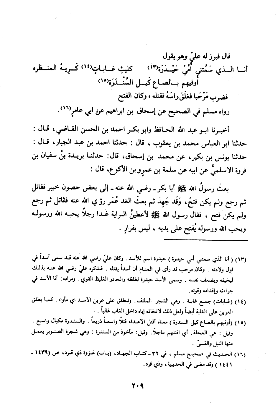فَضَرَبَ مرحبا فغلق رَأْسَهُ فَقَتَلَهُ، وَكَانَ الْفَتْحُ رَوَاهُ مُسْلِمٌ فِي الصَّحِيحِ عَنْ إِسْحَاقَ بْنِ إِبْرَاهِيمَ عَنْ أَبِي عَامِرٍ [ (16) ] .