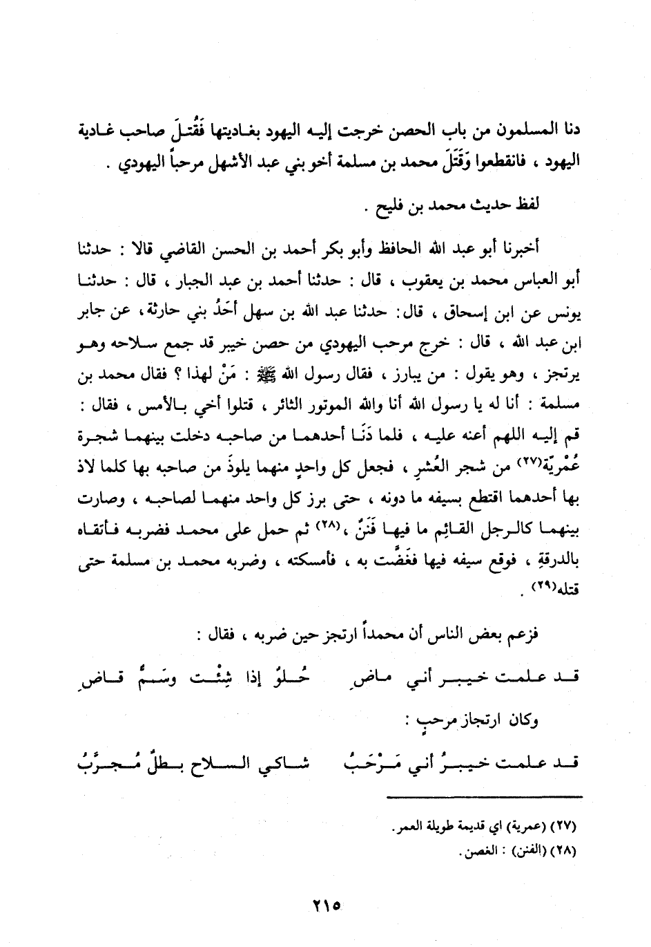 أَخْبَرَنَا أَبُو عَبْدِ الله الْحَافِظُ وأَبُو بَكْرٍ أَحْمَدُ بْنُ الْحَسَنِ الْقَاضِي قَالَا: حَدَّثَنَا أَبُو الْعَبَّاسِ مُحَمَّدُ بْنُ يَعْقُوبَ، قَالَ: حَدَّثَنَا أَحْمَدُ بْنُ عَبْدِ الْجَبَّارِ، قَالَ: حَدَّثَنَا يُونُسُ عَنِ ابْنِ إِسْحَاقَ، قَالَ: حَدَّثَنَا عَبْدُ اللهِ بْنُ سَهْلٍ أَحَدُ بَنِي حَارِثَةَ، عَنْ جابر ابن عَبْدِ اللهِ، قَالَ: خَرَجَ مَرْحَبٌ الْيَهُودِيُّ مِنْ حِصْنِ خَيْبَرَ قَدْ جَمَعَ سِلَاحَهُ وَهُوَ يَرْتَجِزُ، وَهُوَ يَقُولُ: مَنْ يبَارِزُ، فَقَالَ رَسُولُ اللهِ صَلَّى الله عليه وَسَلَّمَ: مَنْ لِهَذَا؟ فَقَالَ مُحَمَّدُ بْنُ مَسْلَمَةَ: أَنَا لَهُ يَا رَسُولَ اللهِ أَنَا وَاللهِ الْمَوْتُورُ الثَّائِرُ، قَتَلُوا أَخِي بِالْأَمْسِ، فَقَالَ: