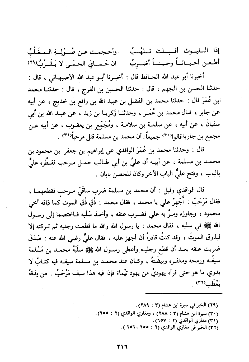 حَدَّثَنَا الْحَسَنُ بْنُ الْجَهْمِ، قَالَ: حَدَّثَنَا الْحُسَيْنُ بْنُ الْفَرَجِ، قَالَ: حَدَّثَنَا مُحَمَّدُ ابن عُمَرَ قَالَ: حَدَّثَنَا مُحَمَّدُ بْنُ الْفَضْلِ بْنِ عُبَيْدِ اللهِ بْنِ رَافِعِ بْنِ خَدِيجٍ، عَنْ أَبِيهِ عَنْ جَابِرٍ، قَالَ مُحَمَّدُ بْنُ عُمَرَ، وَحَدَّثَنَا زَكَرِيَّا بْنُ زَيْدٍ، عَنْ عَبْدِ اللهِ بْنِ أَبِي سُفْيَانَ، عَنْ أَبِيهِ، عَنْ سَلَمَةَ بْنِ سَلَامَةَ، وَمُجَمِّعِ بْنِ يَعْقُوبَ، عَنْ أَبِيهِ عَنْ مُجَمِّعِ بْنِ جَارِيَةَ قَالُوا [ (30) ] جَمِيعًا: إِنَّ مُحَمَّدَ بْنَ مَسْلَمَةَ قَتَلَ مَرْحَبًا [ (31) ] .