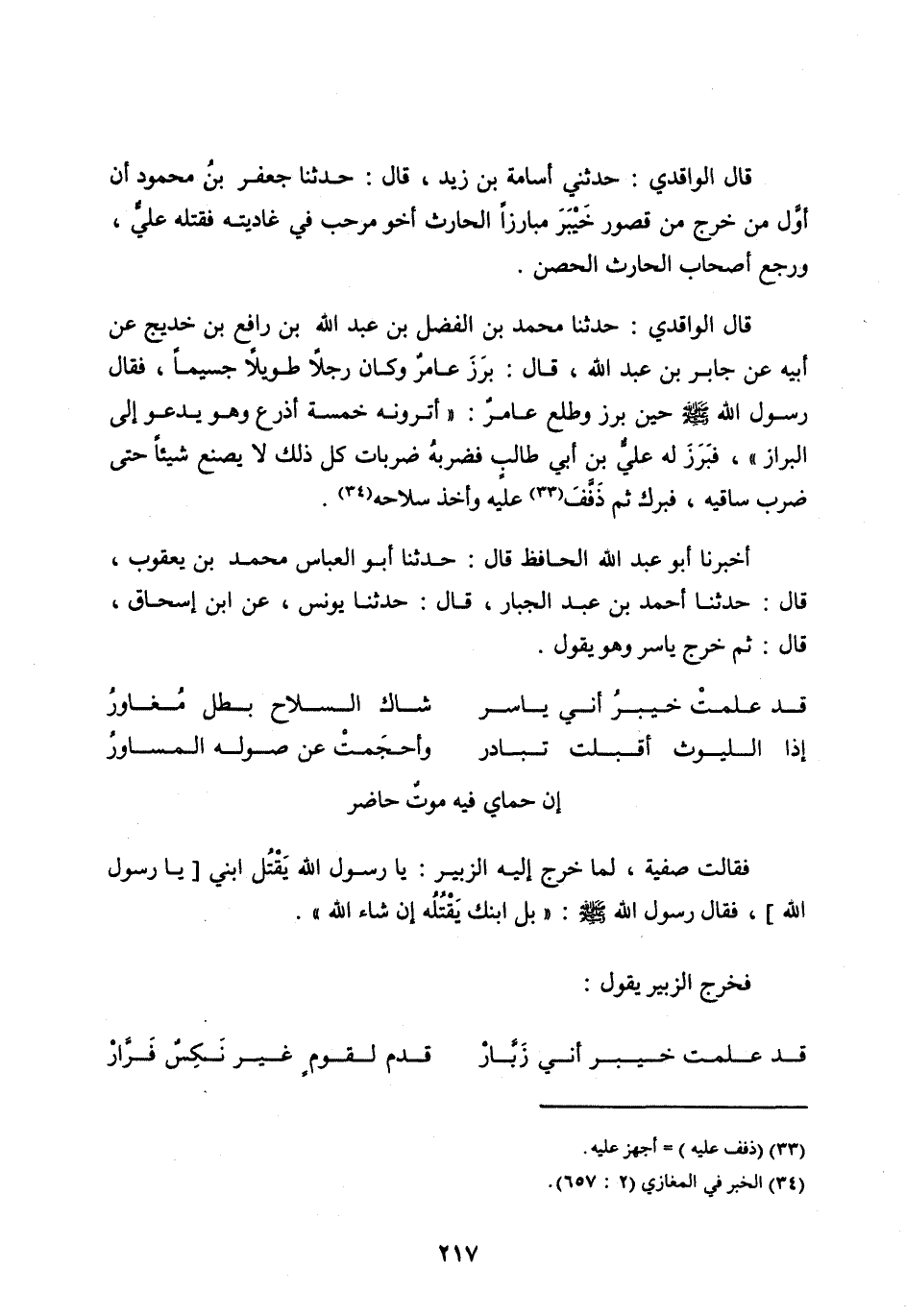 قَالَ الْوَاقِدِيُّ: حَدَّثَنَا مُحَمَّدُ بْنُ الْفَضْلِ بْنِ عَبْدِ اللهِ بْنِ رَافِعِ بْنِ خَدِيجٍ عَنْ أَبِيهِ عَنْ جَابِرِ بْنِ عَبْدِ اللهِ، قَالَ: بَرَزَ عَامِرٌ وَكَانَ رَجُلًا طَوِيلًا جَسِيمًا، فَقَالَ رَسُولُ اللهِ صَلَّى اللهُ عَلَيْهِ وَسَلَّمَ حِينَ بَرَزَ وَطَلَعَ عَامِرٌ: «أَتَرَوْنَهُ خَمْسَةَ أَذْرُعٍ وَهُوَ يَدْعُو إِلَى الْبِرَازِ» ، فَبَرَزَ لَهُ عَلِيُّ بْنُ أَبِي طَالِبٍ فَضَرَبَهُ ضَرَبَاتٍ كُلُّ ذَلِكَ لَا يَصْنَعُ شَيْئًا حَتَّى ضَرَبَ سَاقَيْهِ، فَبَرَكَ ثُمَّ ذَفَّفَ [ (33) ] عَلَيْهِ وَأَخَذَ سِلَاحَهُ [ (34) ] .