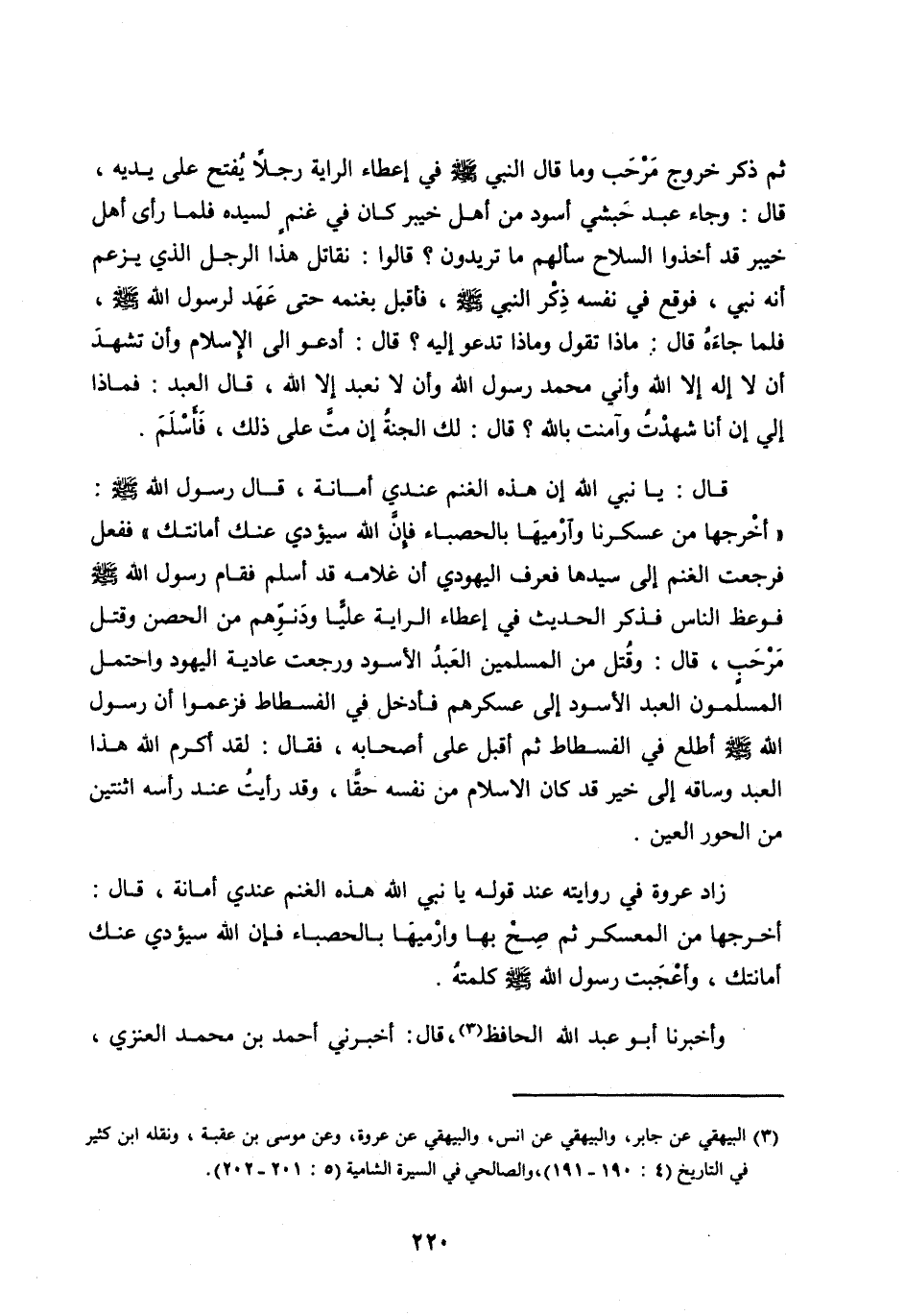 ثُمَّ ذَكَرَ خُرُوجَ مَرْحَبٍ وَمَا قَالَ النَّبِيُّ صَلَّى اللهُ عَلَيْهِ وَسَلَّمَ فِي إِعْطَاءِ الرَّايَةِ رَجُلًا يُفْتَحُ عَلَى يَدَيْهِ، قَالَ: وَجَاءَ عَبْدٌ حَبَشِيٌّ أَسْوَدُ مِنْ أَهْلِ خَيْبَرَ كَانَ فِي غَنَمٍ لِسَيِّدِهِ فَلَمَّا رَأَى أَهْلَ خَيْبَرَ قَدْ أَخَذُوا السِّلَاحَ سَأَلَهُمْ مَا تُرِيدُونَ؟ قَالُوا: نُقَاتِلُ هَذَا الرَّجُلَ الَّذِي يَزْعُمُ أَنَّهُ نَبِيٌّ، فَوَقَعَ فِي نَفْسِهِ ذِكْرُ النَّبِيِّ صَلَّى اللهُ عليه وَسَلَّمَ، فَأَقْبَلَ بِغَنَمِهِ حَتَّى عَهِدَ لِرَسُولِ اللهِ صَلَّى اللهُ عَلَيْهِ وَسَلَّمَ، فَلَمَّا جَاءَهُ قَالَ: مَاذَا تَقُولُ وَمَاذَا تَدْعُو إِلَيْهِ؟ قَالَ: أَدْعُو إِلَى الْإِسْلَامِ وأَنْ تَشْهَدَ أَنْ لَا إِلَهَ إِلَّا اللهُ وَأَنِّي مُحَمَّدٌ رَسُولُ اللهِ وَأَنْ لَا نَعْبُدَ إِلَّا اللهَ، قَالَ الْعَبْدُ: فَمَاذَا إِلَيَّ إِنْ أَنَا شَهِدْتُ وَآمَنْتُ بِاللهِ؟ قَالَ: لَكَ الْجَنَّةُ إِنْ مُتَّ عَلَى ذَلِكَ، فَأَسْلَمَ.