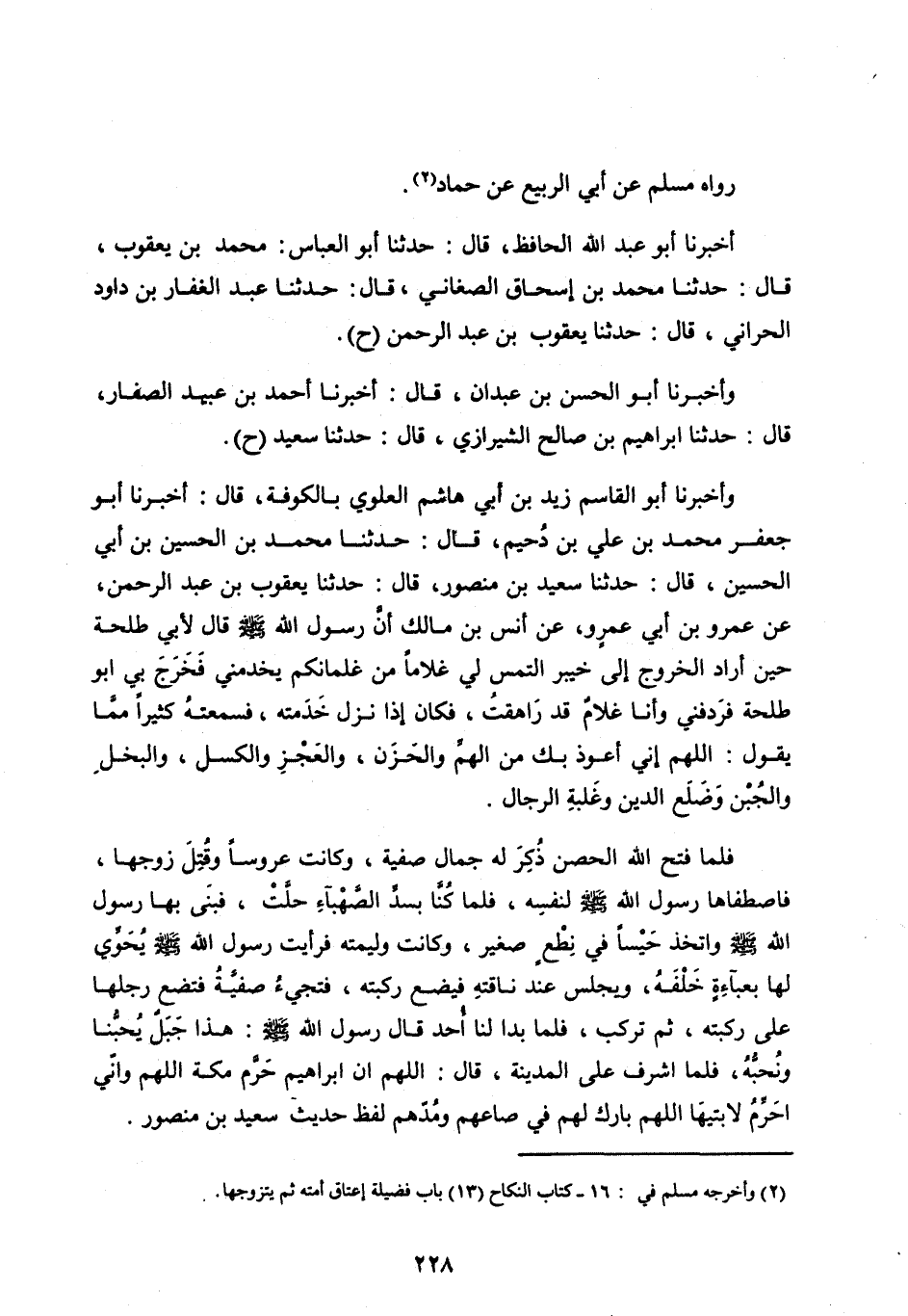 فَلَمَّا فَتَحَ اللهُ الْحِصْنَ ذُكِرَ لَهُ جَمَالُ صَفِيَّةَ، وَكَانَتْ عَرُوسًا وَقُتِلَ زَوْجُهَا، فَاصْطَفَاهَا رَسُولُ اللهِ صَلَّى اللهُ عَلَيْهِ وَسَلَّمَ لِنَفْسِهِ، فَلَمَّا كُنَّا بِسَدِّ الصَّهْبَاءِ حَلَّتْ، فَبَنَى بِهَا رَسُولُ اللهِ صَلَّى الله عليه وسلم وَاتَّخَذَ حَيْسًا فِي نِطْعٍ صَغِيرٍ، وَكَانَتْ وَلِيمَتَهُ فَرَأَيْتُ رَسُولَ اللهِ صَلَّى اللهُ عَلَيْهِ وَسَلَّمَ يُحَوِّي لَهَا بِعَبَاءَةٍ خَلْفَهُ، وَيَجْلِسُ عِنْدَ نَاقَتِهِ فَيَضَعُ رُكْبَتَهُ، فَتَجِيءُ صَفِيَّةُ فَتَضَعُ رِجْلَهَا عَلَى رُكْبَتِهِ، ثُمَّ تَرْكَبُ، فَلَمَّا بَدَا لَنَا أُحُدٌ قَالَ رَسُولُ اللهِ صَلَّى اللهُ عَلَيْهِ وَسَلَّمَ: هَذَا جَبَلٌ يُحِبُّنَا وَنُحِبُّهُ، فَلَمَّا أَشْرَفَ عَلَى الْمَدِينَةِ، قَالَ: اللهُمَّ إِنَّ إِبْرَاهِيمَ حَرَّمَ مَكَّةَ اللهُمَّ وَإِنِّي أُحَرِّمُ لَابَتَيْهَا اللهُمَّ بَارِكْ لَهُمْ فِي صَاعِهِمْ وَمُدِّهِمْ لَفْظُ حَدِيثِ سعيد بن منصور.
