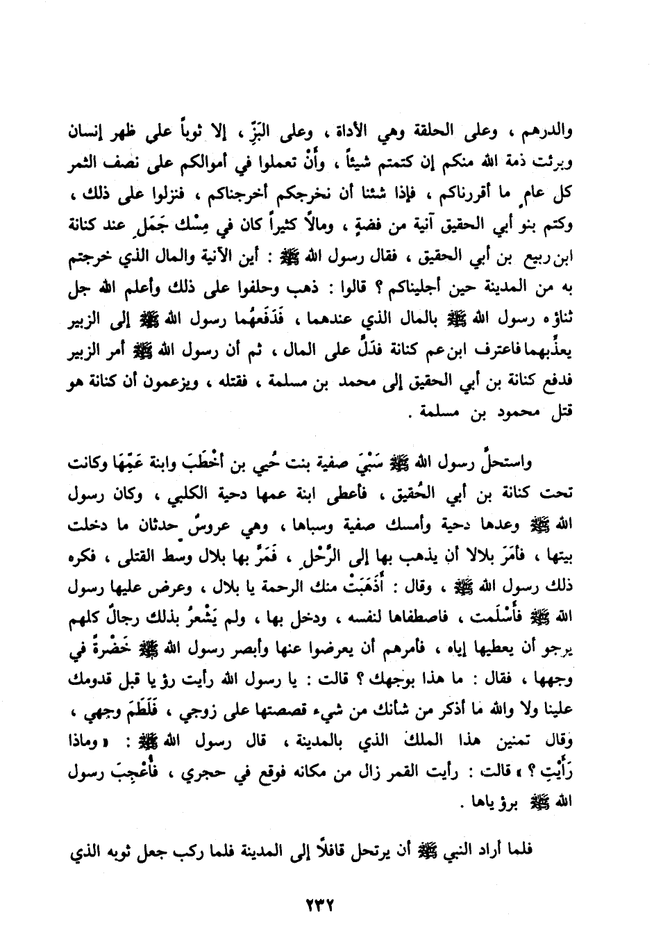 وَاسْتَحَلَّ رَسُولُ اللهِ صَلَّى اللهُ عَلَيْهِ وَسَلَّمَ سَبْيَ صَفِيَّةَ بِنْتِ حُيَيِّ بْنِ أَخْطَبَ وَابْنَةِ عَمِّهَا وَكَانَتْ تَحْتَ كِنَانَةَ بْنِ أَبِي الْحُقَيْقِ، فَأَعْطَى ابْنَةَ عَمِّهَا دِحْيَةَ الْكَلْبِيَّ، وَكَانَ رَسُولُ اللهِ صَلَّى الله عليه وَسَلَّمَ وَعَدَهَا دِحْيَةَ وَأَمْسَكَ صَفِيَّةَ وَسَبَاهَا، وَهِيَ عَرُوسٌ حِدْثَانٌ مَا دَخَلَتْ بَيْتَهَا، فَأَمَرَ بِلَالًا أَنْ يَذْهَبَ بِهَا إِلَى الرَّحْلِ، فَمَرَّ بِهَا بِلَالٌ وَسْطَ الْقَتْلَى، فَكَرِهَ ذَلِكَ رَسُولُ اللهِ صلى اللهُ عَلَيْهِ وَسَلَّمَ، وَقَالَ: أَذَهَبَتْ مِنْكَ الرَّحْمَةُ يَا بِلَالُ، وعُرِضَ عَلَيْهَا رَسُولُ اللهِ صَلَّى اللهُ عَلَيْهِ وَسَلَّمَ فَأَسْلَمْتُ، فَاصْطَفَاهَا لِنَفْسِهِ، وَدَخَلَ بِهَا، وَلَمْ يَشْعُرْ بِذَلِكَ رِجَالٌ كُلُّهُمْ يَرْجُو أَنْ يُعْطِيَهَا إِيَّاهُ، فَأَمَرَهُمْ أَنْ يُعْرِضُوا عَنْهَا وَأَبْصَرَ رَسُولُ اللهِ صَلَّى اللهُ عَلَيْهِ وَسَلَّمَ خُضْرَةً فِي وَجْهِهَا، فَقَالَ: مَا هَذَا بِوَجْهِكِ؟ قَالَتْ: يَا رَسُولَ اللهِ رَأَيْتُ رُؤْيَا قَبْلَ قُدُومِكَ عَلَيْنَا وَلَا وَاللهِ مَا أَذْكُرُ مِنْ شَأْنِكَ مِنْ شَيْءٍ قَصَصْتُهَا عَلَى زَوْجِي، فَلَطَمَ وَجْهِي، وَقَالَ تَمَنَّيْنَ هَذَا الْمَلِكَ الَّذِي بِالْمَدِينَةِ، قَالَ رَسُولُ اللهِ صَلَّى الله عليه وَسَلَّمَ: «وَمَاذَا رَأَيْتِ؟» قَالَتْ: رَأَيْتُ الْقَمَرَ زَالَ مِنْ مَكَانِهِ فَوَقَعَ فِي حِجْرِي، فَأُعْجِبَ رَسُولُ اللهِ صَلَّى اللهُ عَلَيْهِ وَسَلَّمَ بِرُؤيَاهَا.