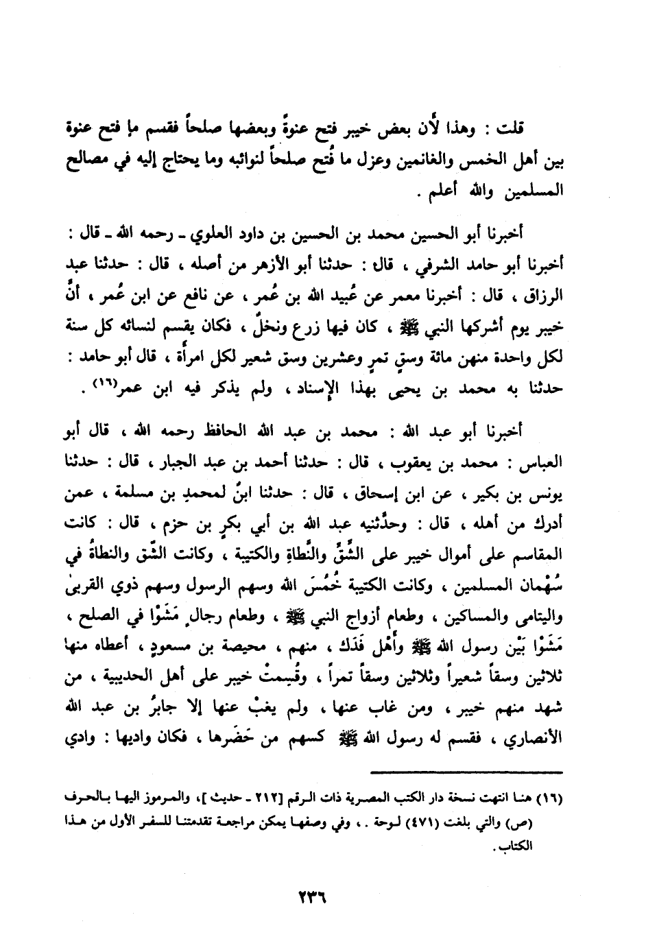 أَخْبَرَنَا أَبُو عَبْدِ اللهِ: مُحَمَّدُ بْنُ عَبْدِ اللهِ الْحَافِظُ رَحِمَهُ اللهُ، قَالَ أَبُو الْعَبَّاسِ: مُحَمَّدُ بْنُ يَعْقُوبَ، قَالَ: حَدَّثَنَا أَحْمَدُ بْنُ عَبْدِ الْجَبَّارِ، قَالَ: حَدَّثَنَا يُونُسُ بْنُ بُكَيْرٍ، عَنِ ابْنِ إِسْحَاقَ، قَالَ: حَدَّثَنَا ابْنٌ لِمُحَمَّدِ بْنِ مَسْلَمَةَ، عَمَّنْ أَدْرَكَ مِنْ أَهْلِهِ، قَالَ: وَحَدَّثَنِيهِ عَبْدُ اللهِ بْنُ أَبِي بَكْرِ بْنِ حَزْمٍ، قَالَ: كَانَتِ الْمَقَاسِمُ عَلَى أَمْوَالِ خَيْبَرَ عَلَى الشَّقِّ وَالنَّطَاةِ وَالْكُتَيْبَةِ، وَكَانَتِ الشَّقُّ وَالنَّطَاةُ فِي سُهْمَانِ الْمُسْلِمِينَ، وَكَانَتِ الْكُتَيْبَةُ خُمُسَ اللهِ وَسَهْمَ الرَّسُولِ وَسَهْمَ ذَوِي الْقُرْبَى وَالْيَتَامَى وَالْمَسَاكِينِ، وَطَعَامَ أَزْوَاجِ النبي صلى الله عليه وَسَلَّمَ، وَطَعَامَ رِجَالٍ مَشَوْا فِي الصُّلْحِ، مَشَوْا بَيْنَ رَسُولِ اللهِ صَلَّى الله عَلَيْهِ وَسَلَّمَ وَأَهْلِ فَدَكٍ، مِنْهُمْ، مُحَيِّصَةُ بْنُ مَسْعُودٍ، أَعْطَاهُ مِنْهَا ثَلَاثِينَ وَسْقًا شَعِيرًا وَثَلَاثِينَ وَسْقًا تَمْرًا، وَقُسِمَتْ خَيْبَرُ عَلَى أَهْلِ الْحُدَيْبِيَةِ، مَنْ شَهِدَ مِنْهُمْ خَيْبَرَ، وَمَنْ غَابَ عَنْهَا، وَلَمْ يَغِبْ عَنْهَا إِلَّا جَابِرُ بْنُ عَبْدِ اللهِ الْأَنْصَارِيُّ، فَقَسَمَ لَهُ رَسُولُ اللهِ صَلَّى اللهُ عليه وَسَلَّمَ كَسَهْمِ مَنْ حَضَرَهَا، فكان واديها: وادي