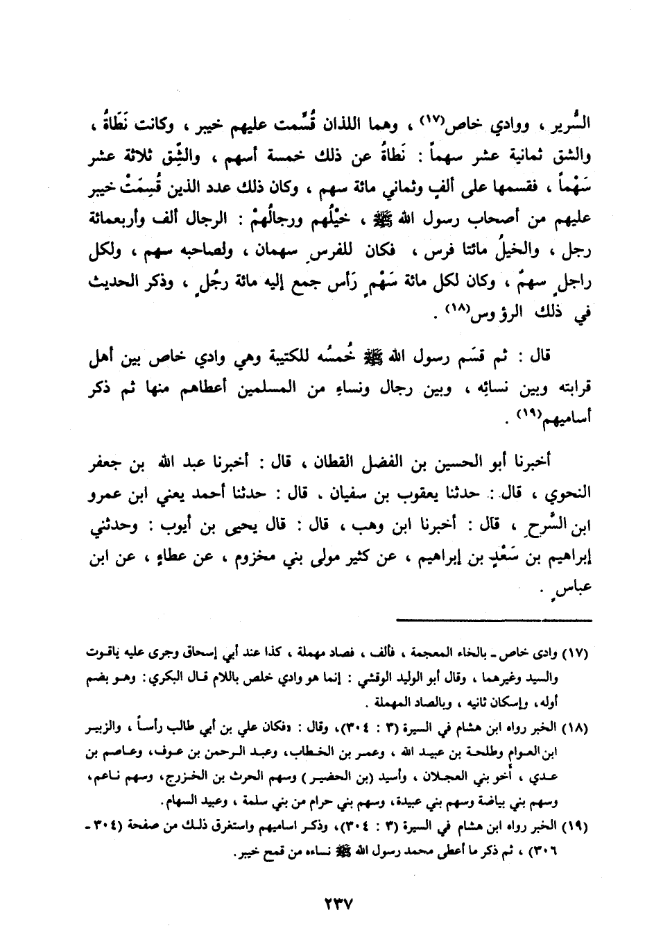 السُّرَيِّرِ، وَوَادِي خَاصٍ [ (17) ] ، وَهُمَا اللَّذَانِ قُسِمَتْ عَلَيْهِمْ خَيْبَرُ، وَكَانَتْ نَطَاةُ، وَالشَّقُّ ثَمَانِيَةَ عَشَرَ سَهْمًا: نَطَاةُ عَنْ ذَلِكَ خَمْسَةُ أَسْهُمٍ، وَالشَّقُّ ثَلَاثَةَ عَشَرَ سَهْمًا، فَقَسَمَهَا على ألف وثماني مائة سَهْمٍ، وَكَانَ ذَلِكَ عَدَدَ الَّذِينَ قُسِمَتْ خَيْبَرُ عَلَيْهِمْ مِنْ أَصْحَابِ رَسُولِ اللهِ صَلَّى اللهُ عَلَيْهِ وسلم، خَيْلُهُمْ وَرِجَالُهُمُ: الرِّجَالُ أَلْفٌ وَأَرْبَعُمِائَةِ رَجُلٍ، وَالْخَيْلُ مِائَتَا فَرَسٍ، فَكَانَ لِلْفَرَسِ سَهْمَانِ، وَلِصَاحِبِهِ سَهْمٌ، وَلِكُلِّ رَاجِلٍ سَهْمٌ، وَكَانَ لِكُلِّ مِائَةِ سَهْمٍ رَأْسٌ جُمِعَ إِلَيْهِ مِائَةُ رَجُلٍ، وَذَكَرَ الْحَدِيثَ في ذلك الرؤوس [ (18) ] .