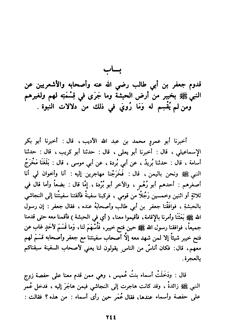 أَخْبَرَنَا أَبُو عَمْرٍو مُحَمَّدُ بْنُ عَبْدِ اللهِ الْأَدِيبُ، قَالَ: أَخْبَرَنَا أَبُو بَكْرٍ الْإِسْمَاعِيلِيُّ، قَالَ: أَخْبَرَنَا أَبُو يَعْلَى، قَالَ: حَدَّثَنَا أَبُو كُرَيْبٍ، قَالَ: حَدَّثَنَا أُسَامَةُ، قَالَ: حَدَّثَنَا بُرَيْدٍ، عَنْ أَبِي بُرْدَةَ، عَنْ أَبِي مُوسَى، قَالَ: بَلَغَنَا مَخْرَجُ النَّبِيِّ صَلَّى اللهُ عليه وسلم وَنَحْنُ بِالْيَمَنِ، قَالَ: فَخَرَجْنَا مُهَاجِرِينَ إِلَيْهِ: أَنَا وَأَخَوَانِ لِي أَنَا أَصْغَرُهُمْ: أَحَدُهُمْ أَبُو رُهْمٍ، وَالْآخَرُ أَبُو بُرْدَةَ، إِمَّا قَالَ: بِضْعًا وَإِمَّا قَالَ فِي ثَلَاثَةٍ أَوِ اثْنَيْنِ وَخَمْسِينَ رَجُلًا مِنْ قَوْمِي، فَرَكِبْنَا سَفِينَةً فَأَلْقَتْنَا سَفِينَتُنَا إِلَى النَّجَاشِيِّ بِالْحَبَشَةِ، فَوَافَقْنَا جَعْفَرَ بْنَ أَبِي طَالِبٍ وَأَصْحَابَهُ عِنْدَهُ، فَقَالَ جَعْفَرُ: إِنَّ رَسُولَ اللهِ صَلَّى اللهُ عَلَيْهِ وَسَلَّمَ بَعَثَنَا وَأَمَرَنَا بِالْإِقَامَةِ، فَأَقِيمُوا مَعَنَا، (أَيْ فِي الْحَبَشَةِ) فَأَقَمْنَا مَعَهُ حَتَّى قَدِمْنَا جَمِيعًا، فَوَافَقْنَا رَسُولَ اللهِ صلى الله عليه وَسَلَّمَ حِينَ فَتَحَ خَيْبَرَ، فَأَسْهَمَ لَنَا، وَمَا قَسَمَ لِأَحَدٍ غَابَ عَنْ فَتْحِ خَيْبَرَ شَيْئًا إِلَّا لِمَنْ شَهِدَ مَعَهُ إِلَّا أَصْحَابَ سَفِينَتِنَا مَعَ جَعْفَرٍ وَأَصْحَابِهِ قَسَمَ لَهُمْ مَعَهُمْ، قَالَ: فَكَانَ أُنَاسٌ مِنَ النَّاسِ يَقُولُونَ لَنَا يَعْنِي لِأَصْحَابِ السَّفِينَةِ سَبَقْنَاكُمْ بالعجرة.