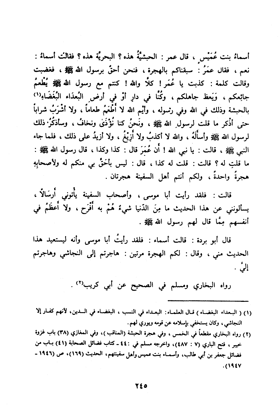 [ (2) ] رواه البخاري مقطعا في الخمس، وفي هجرة الحبشة (المناقب) ، وفي المغازي (38) باب غزوة خيبر، فتح الباري (7: 487) ، وأخرجه مسلم فِي: 44- كِتَابِ فَضَائِلِ الصَّحَابَةِ (41) باب من فضائل جَعْفَرِ بْنِ أَبِي طَالِبٍ، وأسماء بنت عميس وأهل سفينتهم، الحديث (169) ، ص (1946- 1947) .