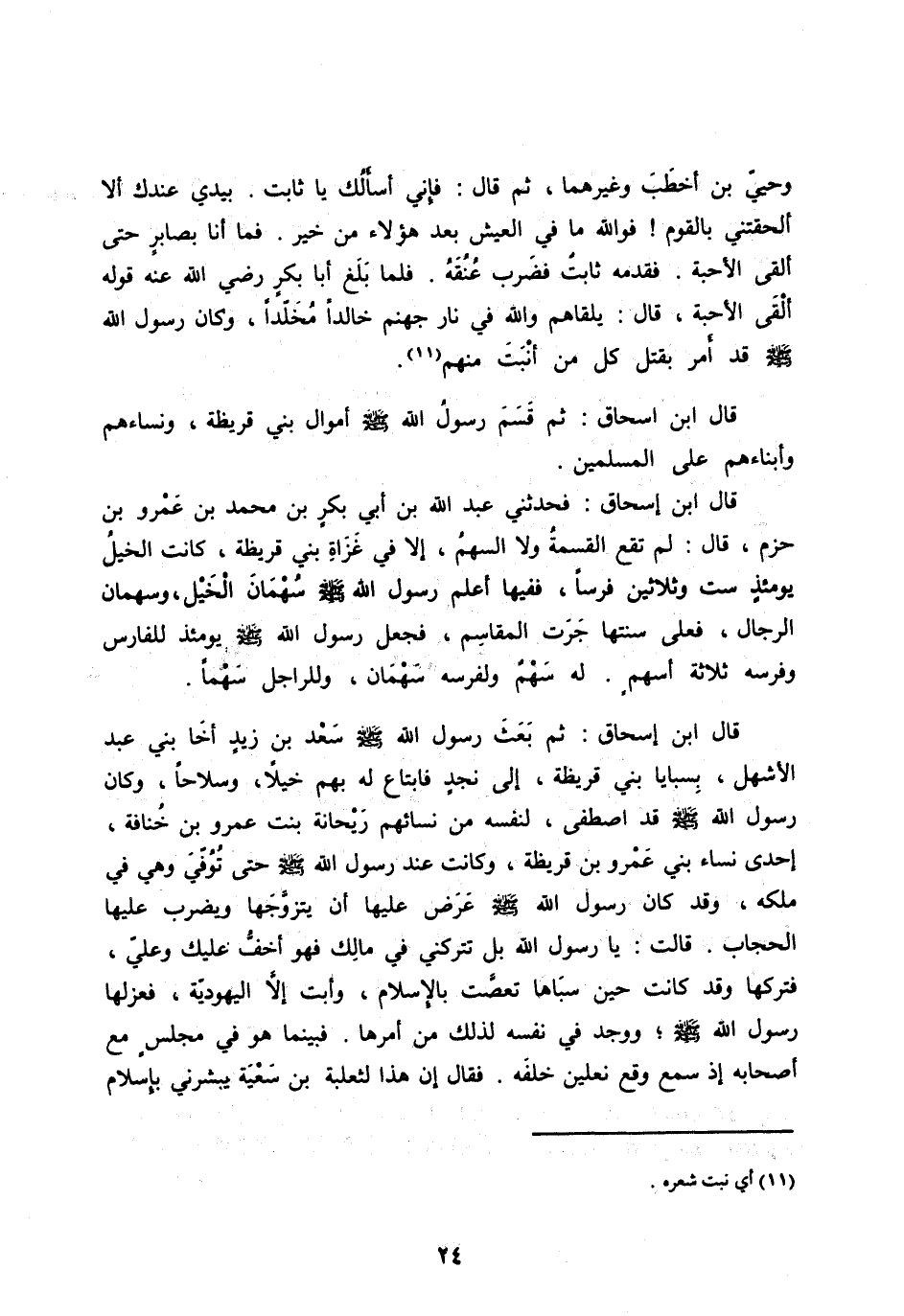فَلَمَّا رَجَعَ رَسُولُ اللهِ صَلَّى الله عليه وسلم مِنَ الْخَنْدَقِ، وَوَضَعَ السِّلَاحَ وَاغْتَسَلَ، فَأَتَاهُ جِبْرِيلُ وَهُوَ يَنْفُضُ رَأْسَهُ مِنَ الْغُبَارِ، قَالَ: قَدْ وَضَعْتَ السِّلَاحَ! وَاللهِ مَا وَضَعْنَاهَا. اخْرُجْ إِلَيْهِمْ، قَالَ رَسُولُ اللهِ صَلَّى اللهُ عَلَيْهِ وَسَلَّمَ: فَأَيْنَ؟ قال: ها هنا، وَأَشَارَ إِلَى بَنِي قُرَيْظَةَ، فَخَرَجَ رَسُولُ اللهِ صَلَّى اللهُ عَلَيْهِ وَسَلَّمَ، فَنَزَلُوا عَلَى حُكْمِ رَسُولِ اللهِ صَلَّى اللهُ عليه وسلم، فَرَدَّ الْحُكْمَ فِيهِ إِلَى سَعْدٍ. قَالَ: فَإِنِّي أَحْكُمُ فِيهِمْ أَنْ تُقْتَلَ الْمُقَاتِلَةُ، وَتُسْبَى الذُّرِّيَّةُ، وَتُقَسَّمَ أَمْوَالُهُمْ. قَالَ أَبِي فَأُخْبِرْتُ أَنَّ رَسُولَ اللهِ صلى اللهُ عَلَيْهِ وَسَلَّمَ. قَالَ: لَقَدْ