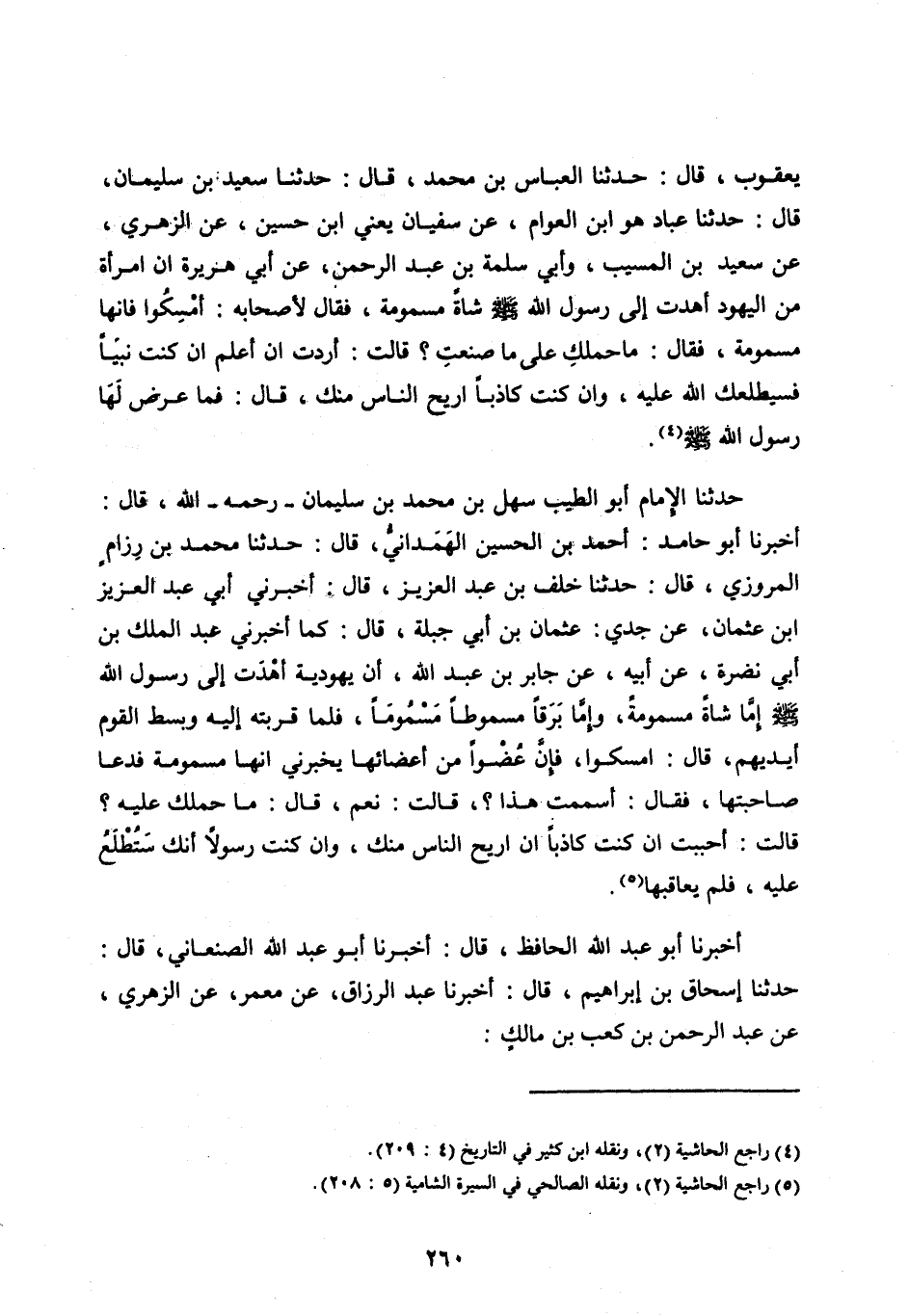 يَعْقُوبَ، قَالَ: حَدَّثَنَا الْعَبَّاسُ بْنُ مُحَمَّدٍ، قَالَ: حَدَّثَنَا سَعِيدُ بْنُ سُلَيْمَانَ، قَالَ: حَدَّثَنَا عَبَّادٌ هُوَ ابْنُ الْعَوَّامِ، عَنْ سُفْيَانَ يَعْنِي ابْنَ حُسَيْنٍ، عَنِ الزُّهْرِيِّ، عَنْ سَعِيدِ بْنِ الْمُسَيِّبِ، وأَبِي سَلَمَةَ بْنِ عَبْدِ الرَّحْمَنِ، عَنْ أَبِي هُرَيْرَةَ أَنَّ امْرَأَةً مِنَ الْيَهُودِ أَهْدَتْ إِلَى رَسُولِ اللهِ صَلَّى الله عليه وسلم شَاةً مَسْمُومَةً، فَقَالَ لِأَصْحَابِهِ: أَمْسِكُوا فَإِنَّهَا مَسْمُومَةٌ، فَقَالَ: مَا حَمَلَكِ عَلَى مَا صَنَعْتِ؟ قَالَتْ: أَرَدْتُ أَنْ أَعْلَمَ إِنْ كُنْتَ نَبِيًّا فَسَيُطْلِعُكَ اللهُ عَلَيْهِ، وَإِنْ كُنْتَ كَاذِبًا أُرِيحُ النَّاسَ مِنْكَ، قَالَ: فَمَا عَرَضَ لَهَا رَسُولُ اللهِ صَلَّى اللهُ عَلَيْهِ وَسَلَّمَ [ (4) ] .