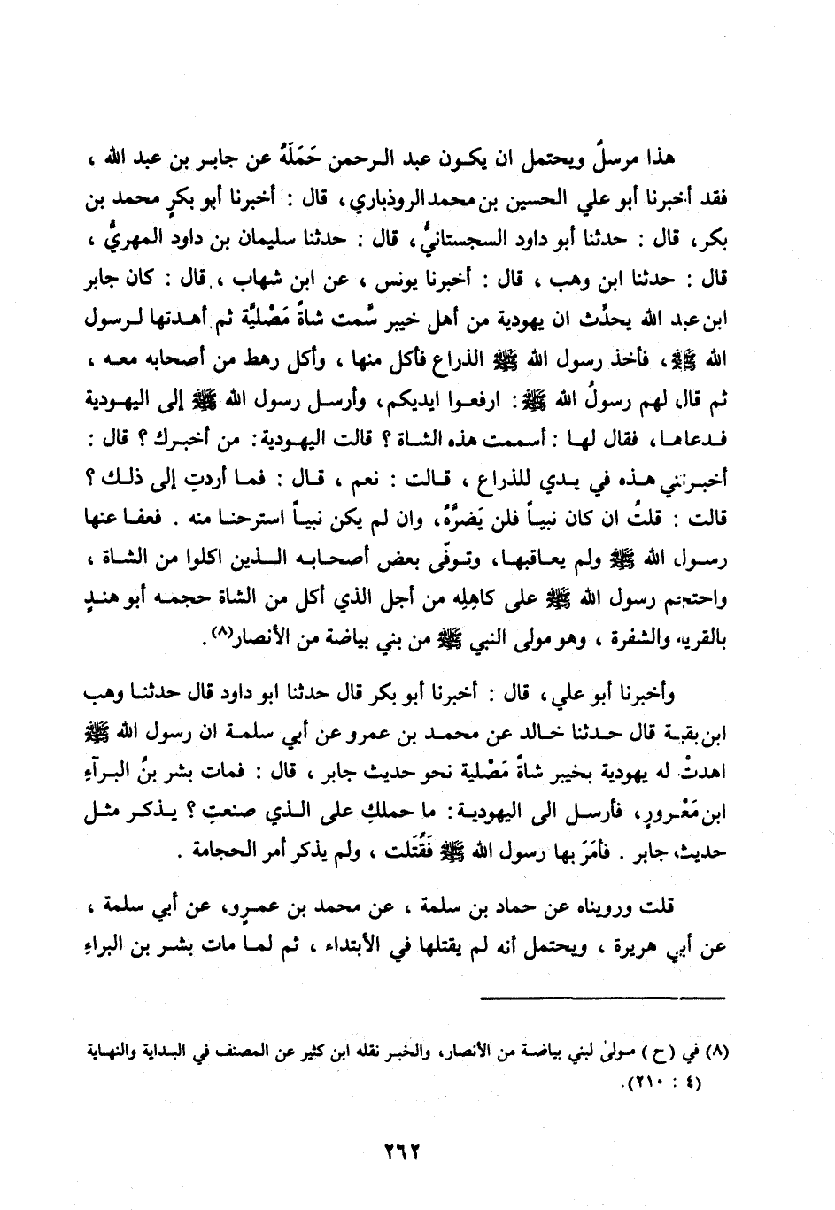 فَقَدْ أَخْبَرَنَا أَبُو عَلِيٍّ الحسين بْنُ مُحَمَّدٍ الرُّوذْبَارِيُّ، قَالَ: أَخْبَرَنَا أَبُو بَكْرٍ مُحَمَّدُ بْنُ بَكْرٍ، قَالَ: حَدَّثَنَا أَبُو دَاوُدَ السِّجِسْتَانِيُّ، قَالَ: حَدَّثَنَا سُلَيْمَانُ بْنُ دَاوُدَ الْمَهْرِيُّ، قَالَ: حَدَّثَنَا ابْنُ وَهْبٍ، قَالَ: أَخْبَرَنَا يُونُسُ، عَنِ ابْنِ شِهَابٍ، قَالَ: كَانَ جَابِرُ ابن عَبْدِ اللهِ يُحَدِّثُ أَنَّ يَهُودِيَّةً مِنْ أَهْلِ خَيْبَرَ سَمَّتْ شَاةً مَصْلِيَّةً ثُمَّ أَهْدَتْهَا لِرَسُولِ اللهِ صَلَّى اللهُ عَلَيْهِ وَسَلَّمَ، فَأَخَذَ رَسُولُ اللهِ صَلَّى الله عَلَيْهِ وَسَلَّمَ الذِّرَاعَ فَأَكَلَ مِنْهَا، وَأَكَلَ رَهْطٌ مِنْ أَصْحَابِهِ مَعَهُ، ثُمَّ قَالَ لَهُمْ رَسُولُ اللهِ صَلَّى اللهُ عَلَيْهِ وَسَلَّمَ: ارْفَعُوا أَيْدِيَكُمْ، وَأَرْسَلَ رَسُولُ اللهِ صلى الله عليه وسلم إِلَى الْيَهُودِيَّةِ فَدَعَاهَا، فَقَالَ لَهَا: أَسَمَمْتِ هَذِهِ الشَّاةَ؟ قَالَتِ الْيَهُودِيَّةُ: مَنْ أَخْبَرَكَ؟ قَالَ: