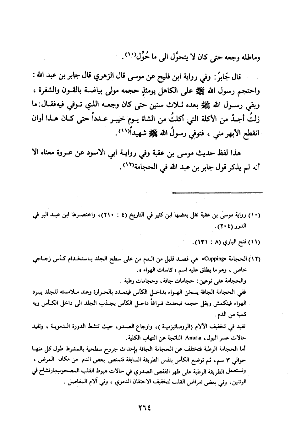 قَالَ جَابِرٌ: وَفِي رِوَايَةِ ابْنُ فُلَيْحٍ عَنْ مُوسَى قَالَ الزُّهْرِيُّ قَالَ جَابِرُ بْنُ عَبْدِ اللهِ: وَاحْتَجَمَ رسول الله صلى الله عَلَيْهِ وَسَلَّمَ عَلَى الْكَاهِلِ يَوْمَئِذٍ حَجَمَهُ مَوْلَى بَيَاضَةَ بالقون وَالشَّفْرَةِ، وَبَقِيَ رَسُولُ اللهِ صَلَّى الله عليه وسلم بَعْدَهُ ثَلَاثَ سِنِينَ حَتَّى كَانَ وَجَعُهُ الَّذِي تُوُفِّيَ فِيهِ فَقَالَ: مَا زِلْتُ أَجِدُ مِنَ الْأُكْلَةِ الَّتِي أَكَلْتُ مِنَ الشَّاةِ يَوْمَ خَيْبَرَ عَدَدًا حَتَّى كَانَ هَذَا أَوَانُ انْقَطَعَ الْأَبْهَرُ مِنِّي، فَتُوُفِّيَ رَسُولُ اللهِ صَلَّى اللهُ عَلَيْهِ وسلم شَهِيدًا [ (11) ] .