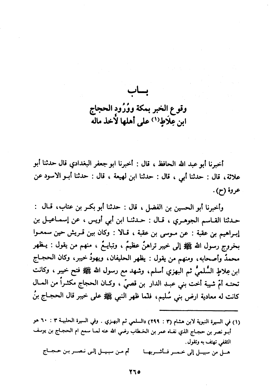 حَدَّثَنَا الْقَاسِمُ الْجَوْهَرِيُّ، قَالَ: حَدَّثَنَا ابْنُ أَبِي أُوَيْسٍ، عَنْ إِسْمَاعِيلُ بْنُ إِبْرَاهِيمَ بْنِ عُقْبَةَ: عَنْ مُوسَى بْنِ عُقْبَةَ، قَالَا: وَكَانَ بَيْنَ قُرَيْشٍ حِينَ سَمِعُوا بِخُرُوجِ رَسُولِ اللهِ صلى الله عليه وسلم إِلَى خَيْبَرَ تَرَاهُنٌ عَظِيمٌ، وَتَبَايُعٌ، مِنْهُمْ مَنْ يَقُولُ: يَظْهَرُ مُحَمَّدٌ وَأَصْحَابُهُ، وَمِنْهُمْ مَنْ يَقُولُ: يَظْهَرُ الْحَلِيفَانِ، وَيَهُودُ خَيْبَرَ، وَكَانَ الْحَجَّاجُ ابن عِلَاطٍ السُّلَمِيُّ ثُمَّ الْبَهْزِيُّ أَسْلَمَ، وَشَهِدَ مَعَ رَسُولِ اللهِ صَلَّى الله عليه وَسَلَّمَ فَتْحَ خَيْبَرَ، وَكَانَتْ تَحْتَهُ أُمُّ شَيْبَةَ أُخْتُ بَنِي عَبْدِ الدَّارِ بْنِ قُصَيٍّ، وَكَانَ الْحَجَّاجُ مُكْثِرًا مِنَ الْمَالِ كَانَتْ لَهُ معادية أَرْضِ بَنِي سُلَيْمٍ، فَلَمَّا ظَهْرَ النَّبِيُّ صَلَّى اللهُ عَلَيْهِ وَسَلَّمَ عَلَى خَيْبَرَ قال الحجاج بن