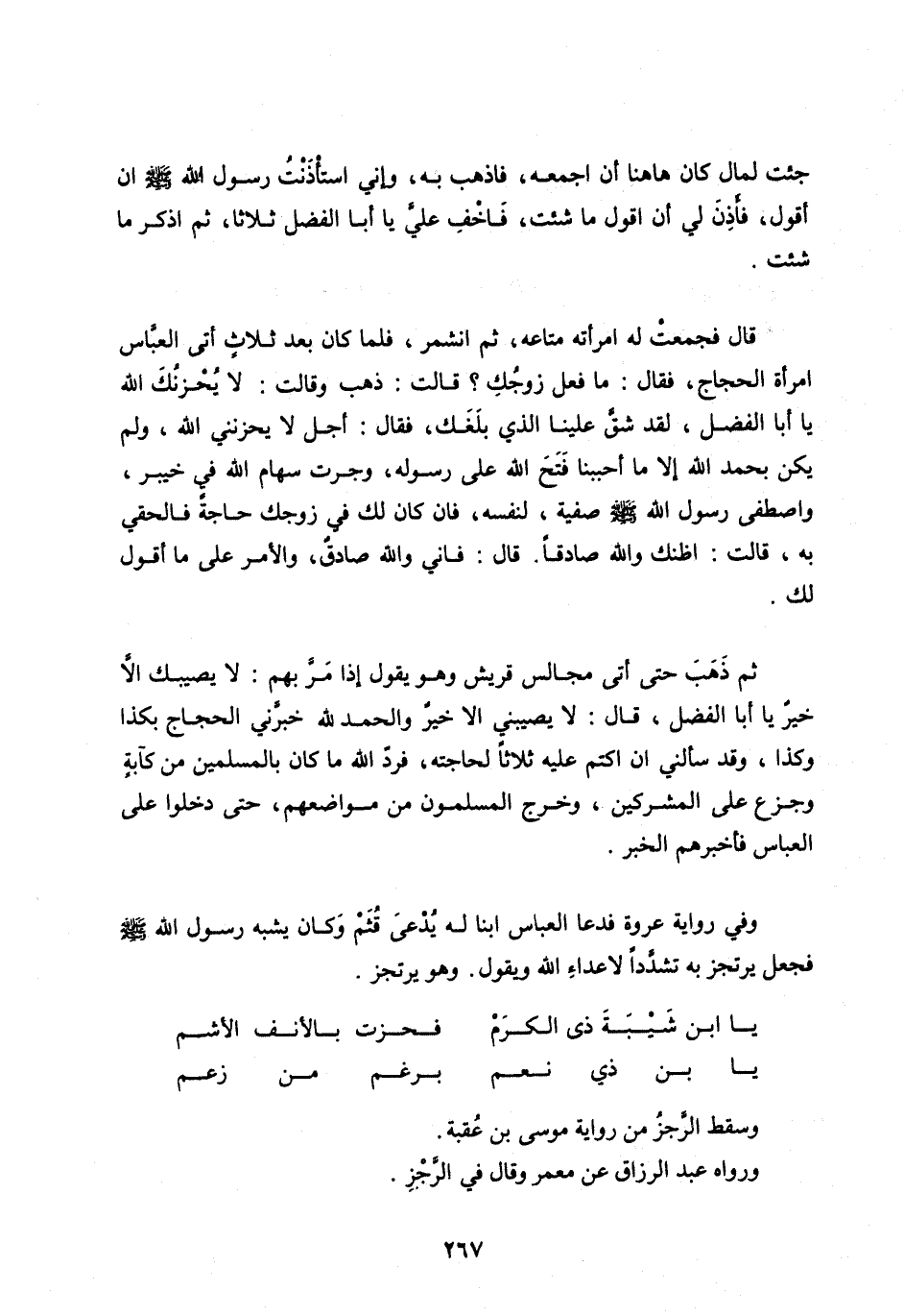 وَفِي رِوَايَةِ عُرْوَةَ فَدَعَا الْعَبَّاسُ ابْنًا لَهُ يُدْعَى قُثَمَ وَكَانَ يُشْبِهُ رَسُولَ اللهِ صَلَّى اللهُ عَلَيْهِ وَسَلَّمَ فَجَعَلَ يَرْتَجِزُ بِهِ تَشَدُّدًا لِأَعْدَاءِ اللهِ وَيَقُولُ. وَهُوَ يَرْتَجِزُ.