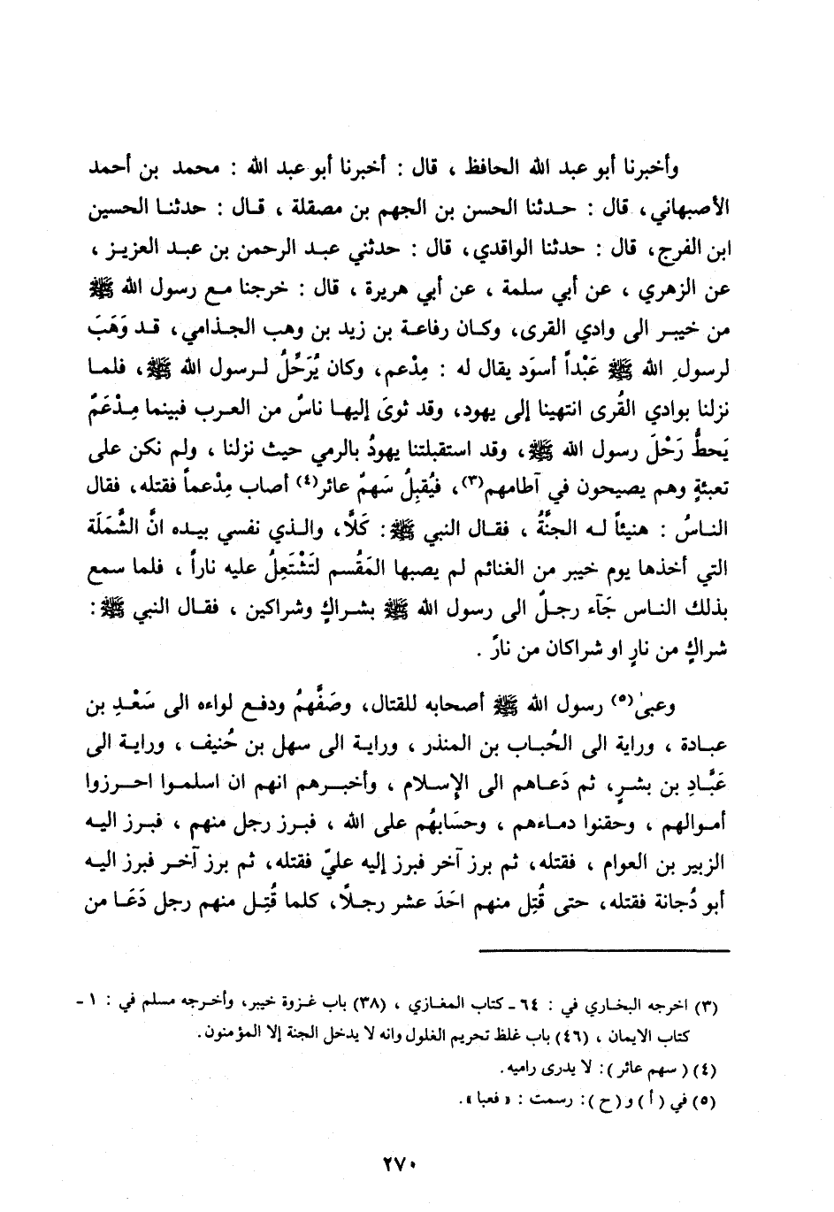 وَأَخْبَرَنَا أَبُو عَبْدِ اللهِ الْحَافِظُ، قَالَ: أَخْبَرَنَا أَبُو عَبْدِ اللهِ: مُحَمَّدُ بْنُ أَحْمَدَ الْأَصْبَهَانِيُّ، قَالَ: حَدَّثَنَا الْحَسَنُ بْنُ الْجَهْمِ بْنِ مَصْقَلَةَ، قَالَ: حَدَّثَنَا الْحُسَيْنُ ابن الْفَرَجِ، قَالَ: حَدَّثَنَا الْوَاقِدِيُّ، قَالَ: حَدَّثَنِي عَبْدُ الرَّحْمَنِ بْنُ عَبْدِ الْعَزِيزِ، عَنِ الزُّهْرِيِّ، عَنْ أَبِي سَلَمَةَ، عَنْ أَبِي هُرَيْرَةَ، قَالَ: خَرَجْنَا مَعَ رَسُولِ اللهِ صَلَّى اللهُ عليه وسلم مِنْ خَيْبَرَ إِلَى وَادِي الْقُرَى، وَكَانَ رِفَاعَةُ بْنُ زَيْدِ بْنِ وَهْبٍ الْجُذَامِيُّ، قَدْ وَهَبَ لِرَسُولِ اللهِ صَلَّى اللهُ عليه وسلم عَبْدًا أَسْوَدَ يُقَالُ لَهُ: مِدْعَمٌ، وَكَانَ يُرَحِّلُ لِرَسُولِ اللهِ صَلَّى اللهُ عليه وَسَلَّمَ، فَلَمَّا نَزَلْنَا بِوَادِي الْقُرَى انْتَهَيْنَا إِلَى يَهُودَ، وَقَدْ ثَوى إِلَيْهَا نَاسٌ مِنَ الْعَرَبِ فَبَيْنَمَا مِدْعَمٌ يَحُطُّ رَحْلَ رَسُولِ اللهِ صَلَّى اللهُ عَلَيْهِ وسلم، وَقَدِ اسْتَقْبَلَتْنَا يَهُودُ بِالرَّمْيِ حَيْثُ نَزَلْنَا، وَلَمْ نَكُنْ عَلَى تَعْبِئَةٍ وَهُمْ يَصِيحُونَ فِي آطَامِهِمْ [ (3) ] ، فَيُقْبِلُ سَهْمٌ عَائِرٌ [ (4) ] أَصَابَ مِدْعَمًا فَقَتَلَهُ، فَقَالَ النَّاسُ: هَنِيئًا لَهُ الْجَنَّةُ، فَقَالَ النَّبِيُّ صَلَّى اللهُ عَلَيْهِ وَسَلَّمَ: كَلَّا، وَالَّذِي نَفْسِي بِيَدِهِ إِنَّ الشَّمْلَةَ الَّتِي أَخَذَهَا يَوْمَ خَيْبَرَ مِنَ الْغَنَائِمِ لَمْ يُصِبْهَا الْمقسم لَتَشْتَعِلُ عَلَيْهِ نَارًا، فَلَمَّا سَمِعَ بِذَلِكَ النَّاسُ جَاءَ رَجُلٌ إِلَى رَسُولِ اللهِ صَلَّى اللهُ عَلَيْهِ وَسَلَّمَ بِشِرَاكٍ وَشِرَاكَيْنِ، فَقَالَ النَّبِيُّ صَلَّى اللهُ عَلَيْهِ وَسَلَّمَ:
