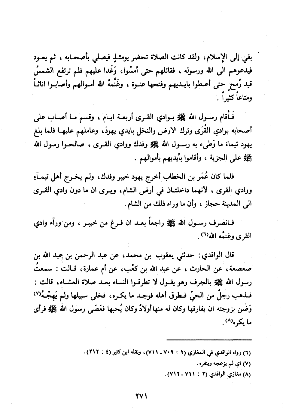 فَانْصَرَفَ رَسُولُ اللهِ صَلَّى اللهُ عَلَيْهِ وَسَلَّمَ رَاجِعًا بَعْدَ أَنْ فَرَغَ مِنْ خَيْبَرَ، وَمِنْ وَرَاءِ وَادِي الْقُرَى وَغَنَّمَهُ اللهُ [ (6) ] .