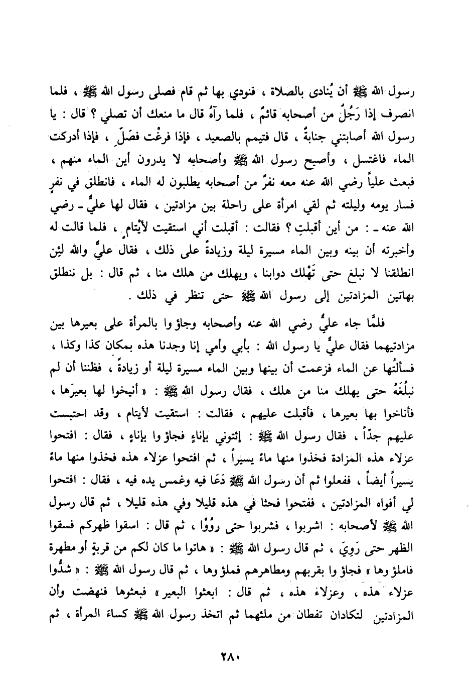 رسول الله صلى الله عَلَيْهِ وَسَلَّمَ أَنْ يُنَادَى بِالصَّلَاةِ، فَنُودِيَ بِهَا ثُمَّ قَامَ فَصَلَّى رَسُولُ اللهِ صَلَّى اللهُ عَلَيْهِ وَسَلَّمَ، فَلَمَّا انْصَرَفَ إِذَا رَجُلٌ مِنْ أَصْحَابِهِ قَائِمٌ، فَلَمَّا رَآهُ قَالَ مَا مَنَعَكَ أَنْ تُصَلِّيَ؟ قَالَ: يَا رَسُولَ اللهِ أَصَابَتْنِي جَنَابَةٌ، قَالَ فَتَيَمَّمْ بِالصَّعِيدِ، فَإِذَا فَرَغْتَ فَصَلِّ، فَإِذَا أَدْرَكْتَ الْمَاءَ فَاغْتَسِلْ، وَأَصْبَحَ رَسُولُ الله صلى الله عليه وَسَلَّمَ وَأَصْحَابُهُ لَا يَدْرُونَ أَيْنَ الْمَاءُ مِنْهُمْ، فَبَعَثَ عَلِيًّا رَضِيَ اللهُ عَنْهُ مَعَهُ نَفَرٌ مِنْ أَصْحَابِهِ يَطْلُبُونَ لَهُ الْمَاءَ، فَانْطَلَقَ فِي نَفَرٍ فَسَارَ يَوْمَهُ وَلَيْلَتَهُ ثُمَّ لَقِيَ امْرَأَةً عَلَى رَاحِلَةٍ بَيْنَ مَزَادَتَيْنِ، فَقَالَ لَهَا عَلِيٌّ- رَضِيَ اللهُ عَنْهُ-: مِنْ أَيْنَ أَقْبَلْتِ؟ فَقَالَتْ: أَقْبَلْتُ إِنِّي اسْتَقَيْتُ لِأَيْتَامٍ، فَلَمَّا قَالَتْ لَهُ وَأَخْبَرَتْهُ أَنَّ بَيْنَهُ وَبَيْنَ الْمَاءِ مَسِيرَةَ لَيْلَةٍ وَزِيَادَةً عَلَى ذَلِكَ، فَقَالَ عَلِيٌّ وَاللهِ لَئِنِ انْطَلَقْنَا لَا نَبْلُغُ حَتَّى تَهْلِكَ دَوَابُّنَا، وَيَهْلِكَ مَنْ هَلَكَ مِنَّا، ثُمَّ قَالَ: بَلْ نَنْطَلِقُ بِهَاتَيْنِ الْمَزَادَتَيْنِ إِلَى رَسُولِ اللهِ صَلَّى اللهُ عَلَيْهِ وَسَلَّمَ حَتَّى تنظر فِي ذَلِكَ.