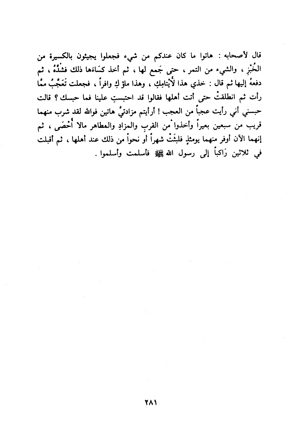 فَجَعَلَتْ تَعْجَبُ مِمَّا رَأَتْ ثُمَّ انْطَلَقَتْ حَتَّى أَتَتْ أَهْلَهَا فَقَالُوا قَدِ احْتبَسْتِ عَلَيْنَا فَمَا حَبَسَكِ؟ قَالَتْ حَبَسَنِي أَنِّي رَأَيْتُ عَجَبًا مِنَ الْعَجَبِ! أَرَأَيْتُمْ مَزْادَتَيَّ هَاتَيْنِ فو الله لَقَدْ شَرِبَ مِنْهُمَا قَرِيبٌ مِنْ سَبْعِينَ بَعِيرًا وَأَخَذُوا مِنَ الْقِرَبِ وَالْمَزَادِ وَالْمَطَاهِرِ مالا أُحْصِي، ثُمَّ إِنَّهُمَا الْآنَ أَوْفَرُ مِنْهُمَا يَوْمَئِذٍ فَلَبِثَتْ شَهْرًا أَوْ نَحْوًا مِنْ ذَلِكَ عِنْدَ أَهْلِهَا، ثُمَّ أَقْبَلَتْ فِي ثَلَاثِينَ رَاكِبًا إِلَى رسول الله صلى اللهُ عَلَيْهِ وَسَلَّمَ فَأَسْلَمَتْ وَأَسْلَمُوا.