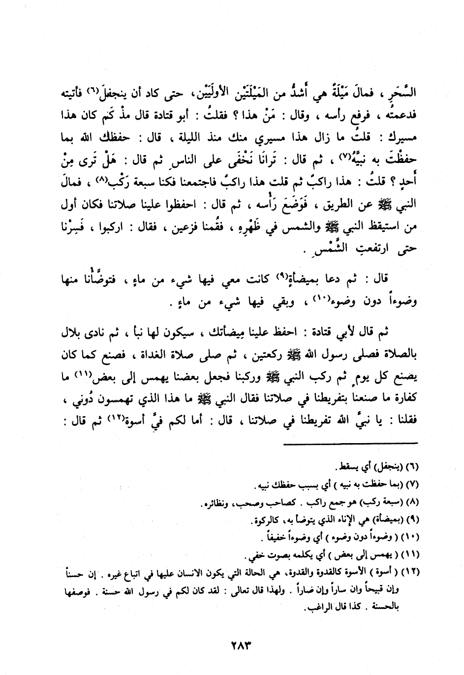 السَّحَرِ، فَمَالَ مَيْلَةً هِيَ أَشَدُّ مِنَ الْمَيْلَتَيْنِ الْأُولَيَيْنِ، حَتَّى كَادَ أَنْ يَنْجَفِلَ [ (6) ] فَأَتَيْتُهُ فَدَعَمْتُهُ، فَرَفَعَ رَأْسَهُ، وَقَالَ: مَنْ هَذَا؟ فَقُلْتُ: أَبُو قَتَادَةَ قَالَ مُذْ كَمْ كَانَ هَذَا مَسِيرَكَ: قُلْتُ مَا زَالَ هَذَا مَسِيرِي مِنْكَ مُنْذُ اللَّيْلَةِ، قَالَ: حَفِظَكَ اللهُ بِمَا حَفِظْتَ بِهِ نَبِيَّهُ [ (7) ] ، ثُمَّ قَالَ: تَرَانَا نَخْفَى عَلَى النَّاسِ ثُمَّ قَالَ: هَلْ تَرَى مِنْ أَحَدٍ؟ قُلْتُ: هَذَا رَاكِبٌ ثُمَّ قُلْتُ هَذَا رَاكِبٌ فَاجْتَمَعْنَا فَكُنَّا سَبْعَةَ رَكْبٍ [ (8) ] ، فَمَالَ النَّبِيُّ صلى الله عليه وسلم عَنِ الطَّرِيقِ، فَوَضَعَ رَأْسَهُ، ثُمَّ قَالَ: احْفَظُوا عَلَيْنَا صَلَاتَنَا فَكَانَ أَوَّلَ مَنِ اسْتَيْقَظَ النَّبِيُّ صَلَّى اللهُ عَلَيْهِ وَسَلَّمَ وَالشَّمْسُ فِي ظَهْرِهِ، فَقُمْنَا فَزِعِينَ، فَقَالَ: ارْكَبُوا، فَسِرْنَا حَتَّى ارْتَفَعَتِ الشَّمْسُ.