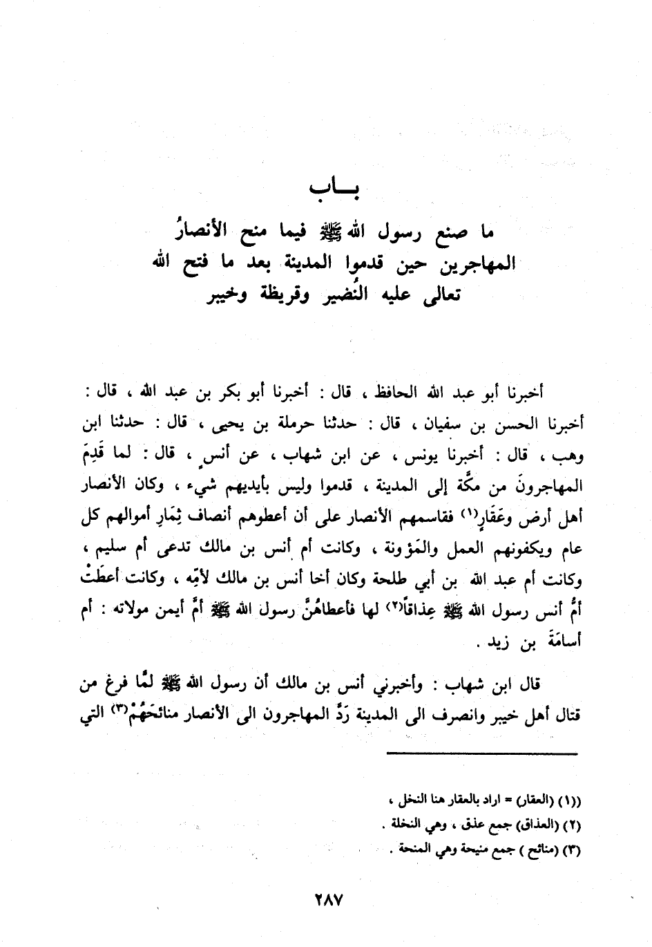 قَالَ ابْنُ شِهَابٍ: وَأَخْبَرَنِي أَنَسِ بْنِ مَالِكٍ أَنَّ رَسُولَ اللهِ صَلَّى الله عَلَيْهِ وَسَلَّمَ لَمَّا فَرَغَ مِنْ قِتَالِ أَهْلِ خَيْبَرَ وَانْصَرَفَ الى المدينة ردّ المهاجرون إِلَى الْأَنْصَارِ مَنَائِحَهُمُ [ (3) ] الَّتِي