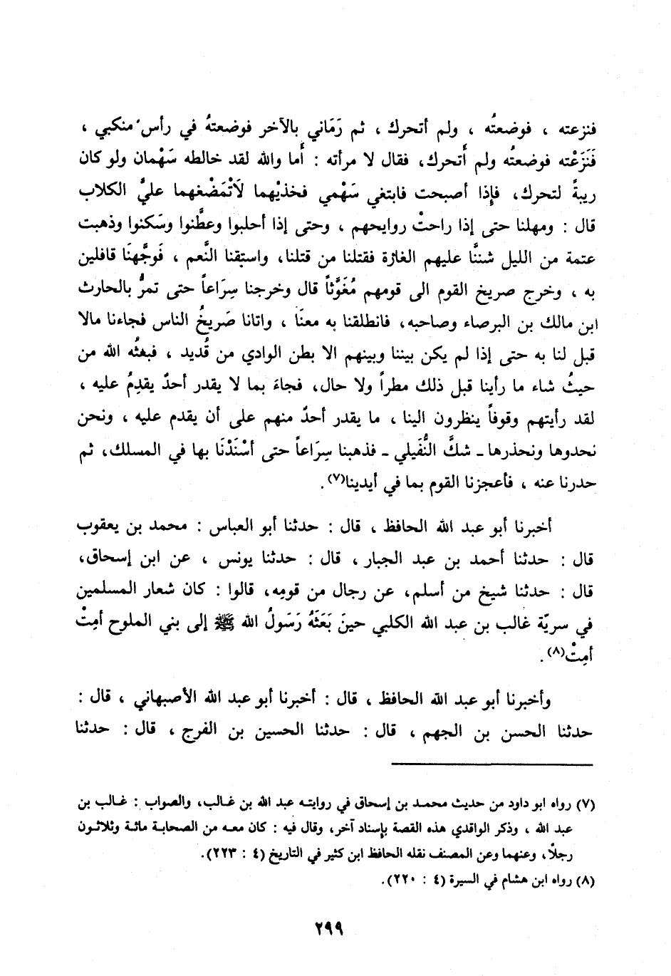 [ (7) ] رواه ابو داود مِنْ حَدِيثِ مُحَمَّدِ بْنِ إِسْحَاقَ في روايته عبد الله بن غالب، والصواب: غالب بْنُ عَبْدِ اللهِ، وَذَكَرَ الواقدي هذه القصة بإسناد آخر، وقال فيه: كَانَ مَعَهُ مِنَ الصَّحَابَةِ مائة وثلاثون رجلا، وعنهما وعن المصنف نقله الحافظ ابن كثير في التاريخ (4: 223) .
