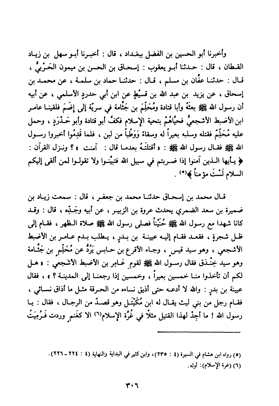 وأَخْبَرَنَا أَبُو الْحُسَيْنِ بْنُ الْفَضْلِ بِبَغْدَادَ، قَالَ: أَخْبَرَنَا أَبُو سَهْلِ بْنُ زِيَادِ الْقَطَّانُ، قَالَ: حَدَّثَنَا أَبُو يَعْقُوبَ: إِسْحَاقُ بْنُ الْحَسَنِ بْنِ مَيْمُونٍ الْحَرْبِيُّ، قَالَ: حَدَّثَنَا عَفَّانُ بْنُ مُسْلِمٍ، قَالَ: حَدَّثَنَا حَمَّادُ بْنُ سَلَمَةَ، عَنْ مُحَمَّدِ بْنِ إِسْحَاقَ، عَنْ يَزِيدَ بْنِ عَبْدِ اللهِ بْنِ قُسَيْطٍ عَنِ ابْنِ أَبِي حَدْرَدٍ الْأَسْلَمِيِّ، عَنْ أَبِيهِ أَنَّ رَسُولَ اللهِ صَلَّى اللهُ عَلَيْهِ وَسَلَّمَ بَعَثَهُ وَأَبَا قَتَادَةَ وَمُحَلِّمَ بْنَ جَثَّامَةَ فِي سَرِيَّةٍ إِلَى إِضَمٍ فَلَقِيَنَا عامر ابن الْأَضْبَطِ الْأَشْجَعِيُّ فَحَيَّاهُمْ بِتَحِيَّةِ الْإِسْلَامِ فَكَفَّ أَبُو قَتَادَةَ وَأَبُو حَدْرَدٍ، وَحَمَلَ عَلَيْهِ مُحَلِّمٌ فَقَتَلَهُ وَسَلَبَهُ بَعِيرًا لَهُ وَسِقَاءً وَوَطْبًا مِنْ لَبَنٍ، فَلَمَّا قَدِمُوا أَخْبَرُوا رَسُولَ اللهِ صلى الله عَلَيْهِ وَسَلَّمَ فَقَالَ رَسُولُ الله صلى الله عليه وسلّم: «أَقَتَلْتَهُ بَعْدَ مَا قَالَ: آمَنْتُ» ؟