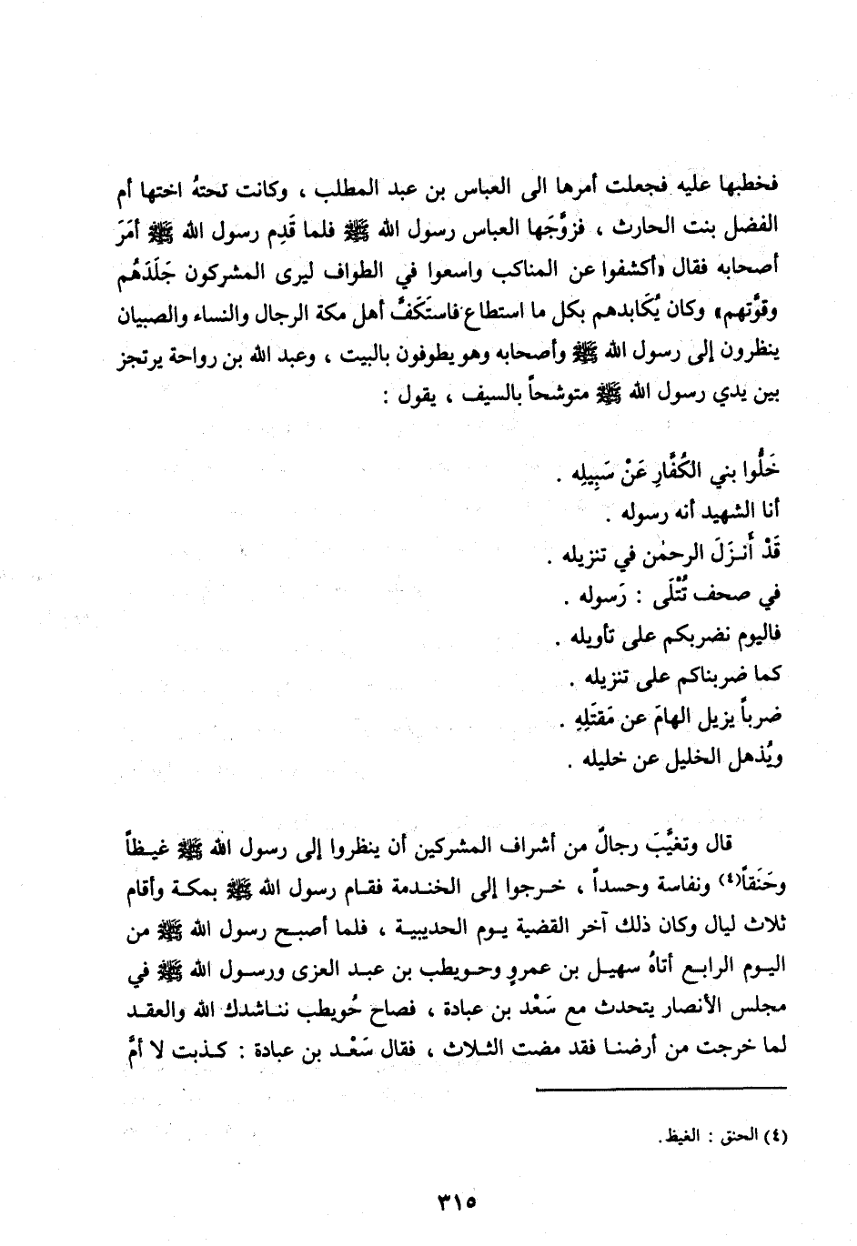 قَالَ وَتَغَيَّبَ رِجَالٌ مِنْ أَشْرَافِ الْمُشْرِكِينَ أَنْ يَنْظُرُوا إِلَى رَسُولِ اللهِ صَلَّى اللهُ عَلَيْهِ وَسَلَّمَ غَيْظًا وَحَنْقًا [ (4) ] وَنَفَاسَةً وَحَسَدًا، خَرَجُوا إِلَى الْخَنْدَمَةِ فَقَامَ رَسُولُ اللهِ صَلَّى اللهُ عَلَيْهِ وَسَلَّمَ بِمَكَّةَ وَأَقَامَ ثَلَاثَ لَيَالٍ وَكَانَ ذَلِكَ آخِرَ الْقَضِيَّةِ يَوْمَ الْحُدَيْبِيَةِ، فَلَمَّا أَصْبَحَ رَسُولُ اللهِ صَلَّى اللهُ عَلَيْهِ وسلم مِنَ الْيَوْمِ الرَّابِعِ أَتَاهُ سُهَيْلُ بْنُ عَمْرٍو وَحُوَيْطِبَ بِنَ عَبْدِ الْعُزَّى وَرَسُولُ اللهِ صَلَّى اللهُ عليه وسلم فِي مَجْلِسِ الْأَنْصَارِ يَتَحَدَّثُ مَعَ سَعْدِ بْنِ عُبَادَةَ، فَصَاحَ حُوَيْطِبٌ نُنَاشِدُكَ اللهَ وَالْعَقْدَ لَمَا خَرَجْتَ مِنْ أَرْضِنَا فَقَدْ مَضَتِ الثَّلَاثُ، فَقَالَ سَعْدُ بْنُ عُبَادَةَ: كَذَبْتَ لَا أُمَّ