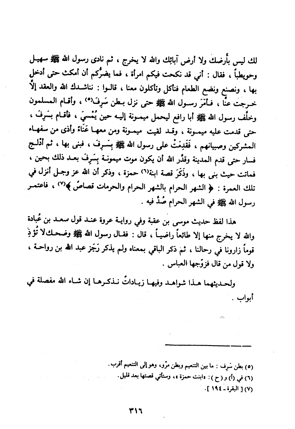 لَكَ لَيْسَ بِأَرْضِكَ وَلَا أَرْضِ آبَائِكَ وَاللهِ لَا يَخْرُجُ، ثُمَّ نَادَى رَسُولُ اللهِ صَلَّى الله عليه وسلّم سهيل وَحُوَيْطِبًا، فَقَالَ: إِنِّي قَدْ نَكَحْتُ فِيكُمُ امْرَأَةً، فَمَا يَضُرُّكُمْ أَنْ أَمْكُثَ حَتَّى أَدْخُلَ بِهَا، وَنَصْنَعُ وَنَضَعُ الطَّعَامَ فَنَأْكُلُ وَتَأْكُلُونَ مَعَنَا، قَالُوا: نُنَاشِدُكَ اللهَ وَالْعَقْدَ إِلَّا خَرَجْتَ عَنَّا، فَأَمَرَ رَسُولُ اللهِ صَلَّى اللهُ عَلَيْهِ وَسَلَّمَ حَتَّى نَزَلَ بَطْنَ سَرِفَ [ (5) ] ، وَأَقَامَ الْمُسْلِمُونَ وَخَلَّفَ رَسُولُ اللهِ صَلَّى اللهُ عَلَيْهِ وَسَلَّمَ أَبَا رَافِعٍ لِيَحْمِلَ مَيْمُونَةَ إِلَيْهِ حِينَ يُمْسِي، فَأَقَامَ بِسَرِفَ، حَتَّى قَدِمَتْ عَلَيْهِ مَيْمُونَةُ، وَقَدْ لَقِيَتْ مَيْمُونَةُ وَمَنْ مَعَهَا عَنَاءً وَأَذًى مِنْ سُفَهَاءِ الْمُشْرِكِينَ وَصِبْيَانِهِمْ، فَقَدِمَتْ علي رسول الله صلى اللهُ عَلَيْهِ وَسَلَّمَ بِسَرِفَ، فَبَنَى بِهَا، ثُمَّ أَدْلَجَ فَسَارَ حَتَّى قَدِمَ الْمَدِينَةَ وَقَدَّرَ اللهُ أَنْ يَكُونَ مَوْتُ مَيْمُونَةَ بِسَرِفَ بَعْدَ ذَلِكَ بِحِينٍ، فَمَاتَتْ حَيْثُ بَنَى بِهَا، وَذَكَرَ قِصَّةَ ابْنَةِ [ (6) ] حَمْزَةَ، وَذُكِرَ أَنَّ اللهَ عَزَّ وَجَلَّ أَنْزَلَ فِي تِلْكَ الْعُمْرَةِ: الشَّهْرُ الْحَرامُ بِالشَّهْرِ الْحَرامِ وَالْحُرُماتُ قِصاصٌ [ (7) ] ، فَاعْتَمَرَ رَسُولُ اللهِ صَلَّى اللهُ عَلَيْهِ وَسَلَّمَ فِي الشهر الحرام صُدَّ فِيهِ.