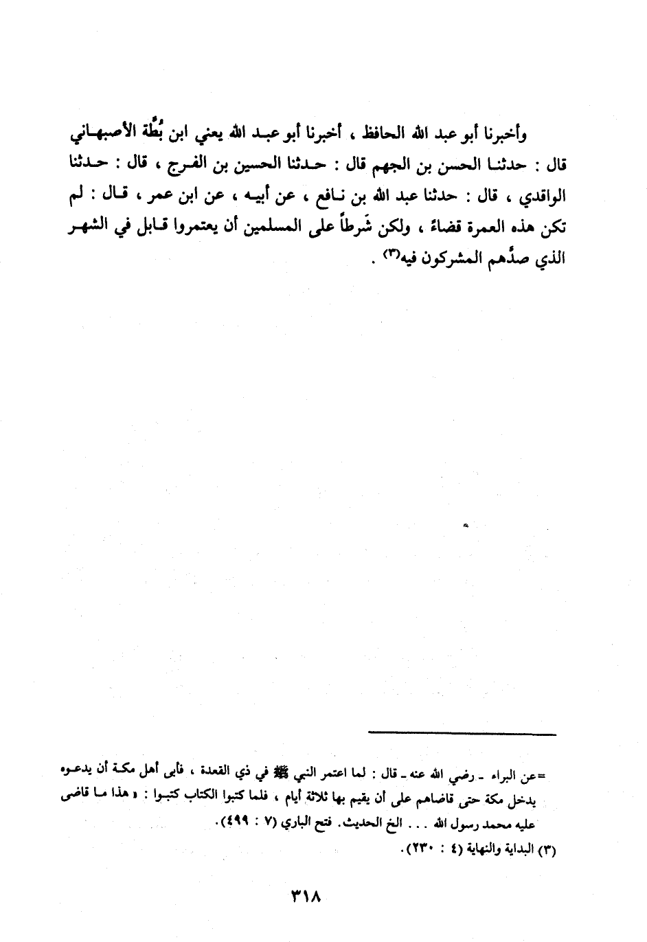 وأَخْبَرَنَا أَبُو عَبْدِ اللهِ الْحَافِظُ، أَخْبَرَنَا أَبُو عَبْدِ اللهِ يَعْنِي ابْنَ بُطَّةَ الْأَصْبَهَانِيُّ قَالَ: حَدَّثَنَا الْحَسَنُ بْنُ الْجَهْمِ قَالَ: حَدَّثَنَا الْحُسَيْنُ بْنُ الْفَرَجِ، قَالَ: حَدَّثَنَا الْوَاقِدِيُّ، قَالَ: حَدَّثَنَا عَبْدُ اللهِ بْنُ نَافِعٍ، عَنْ أَبِيهِ، عَنِ ابْنِ عُمَرَ، قَالَ: لَمْ تَكُنْ هَذِهِ الْعُمْرَةُ قَضَاءً، وَلَكِنْ شَرْطًا عَلَى الْمُسْلِمِينَ أَنْ يعتمروا قابل فِي الشَّهْرِ الَّذِي صَدَّهُمُ المشركون فيه [ (3) ] .
