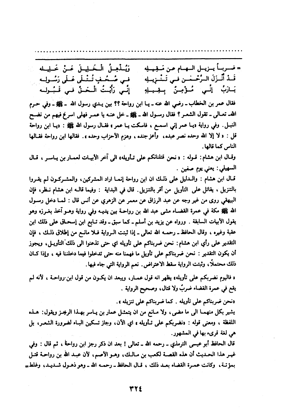 قال ابن هشام: والدليل على ذلك ان ابن رواحة إنما أراد المشركين، والمشركون لم يقروا بالتنزيل، يقاتل على التأويل من أقر بالتنزيل. قال في البداية: وفيما قاله ابن هشام نظر، فإن البيهقي روى من غير وجه عن عبد الرزاق عن معمر عن الزهري عن أنس قال: لما دخل رسول الله صلى الله عليه وسلّم مكة في عمرة القضاء مشى عبد الله بن رواحة بين يديه وفي رواية وهو آخذ بغرزه وهو يقول الأبيات السابقة. ورواه عن يزيد بن أسلم- كما سبق- وقد تابع ابن إسحاق على ذلك ابن عقبة وغيره، وقال الحافظ- رحمه الله تعالى- إذا ثبتت الرواية فلا مانع من إطلاق ذلك، فإن التقدير على رأي ابن هشام: نحن ضربناكم على تأويله اي حتى تذعنوا الى ذلك التأويل، ويجوز أن يكون التقدير: نحن ضربناكم على تأويل ما فهمنا منه حتى تدخلوا فيما دخلنا فيه، وإذا كان ذلك محتملا، وثبتت الرواية سقط الاعتراض. نعم الرواية التي جاء فيها.