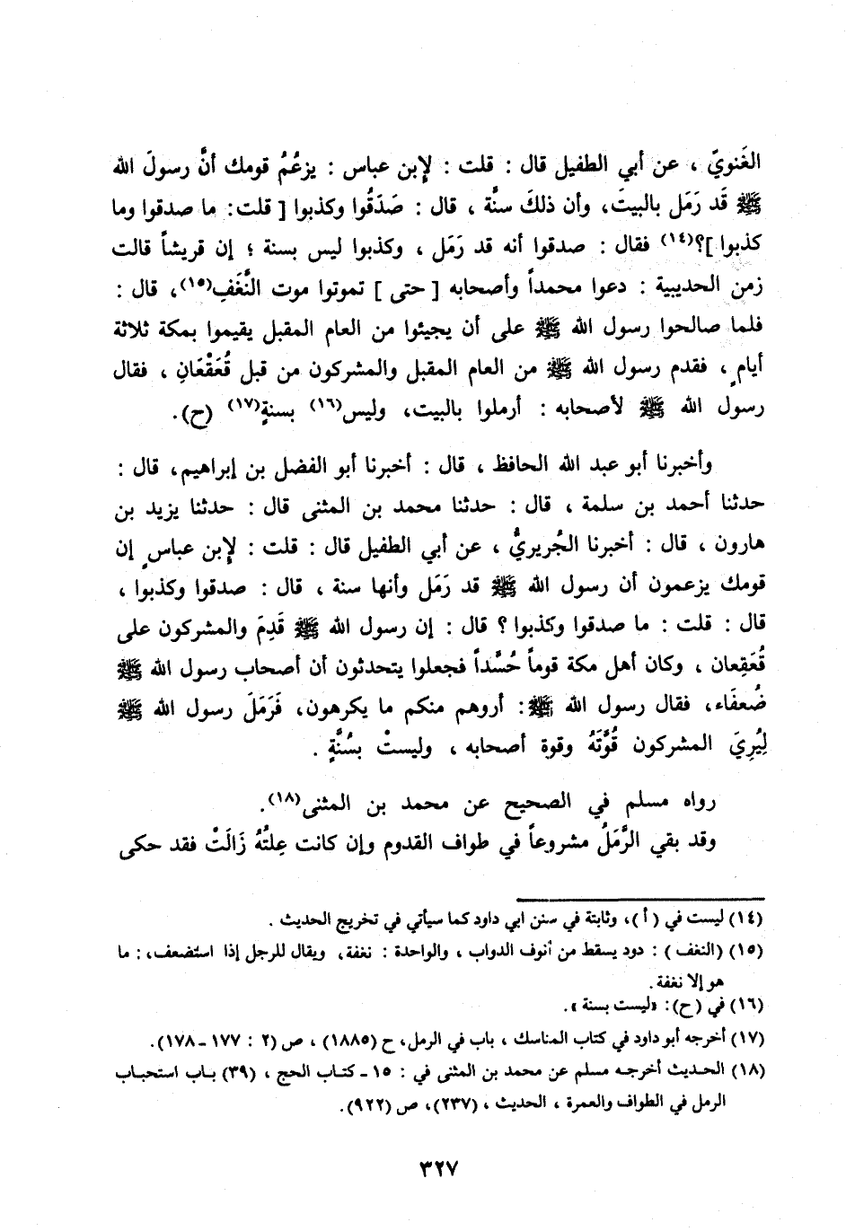 [ (18) ] الحديث أخرجه مُسْلِمٌ عَنْ مُحَمَّدِ بْنِ المثنى في: 15- كتاب الحج، (39) باب استحباب الرمل في الطواف والعمرة، الحديث، (237) ، ص (922) .