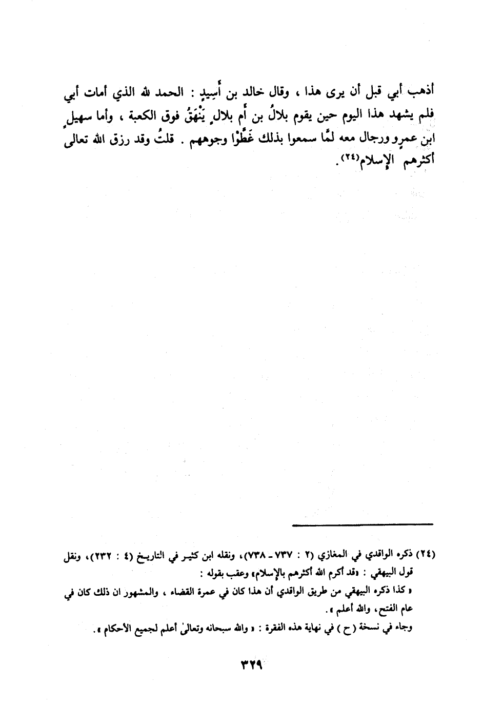 أَذْهَبَ أَبِي قَبْلَ أَنْ يَرَى هَذَا، وَقَالَ خَالِدُ بْنُ أُسَيْدٍ: الْحَمْدُ لِلَّهِ الَّذِي أَمَاتَ أَبِي فَلَمْ يَشْهَدْ هَذَا الْيَوْمَ حِينَ يَقُومُ بِلَالُ بْنُ أُمِّ بِلَالٍ يَنْهَقُ فَوْقَ الْكَعْبَةِ، وأما سهيل ابن عَمْرٍو وَرِجَالٌ مَعَهُ لَمَّا سَمِعُوا بِذَلِكَ غَطَّوْا وُجُوهَهُمْ. قُلْتُ وَقَدْ رَزَقَ اللهُ تعالى أكثرهم الإسلام [ (24) ] .