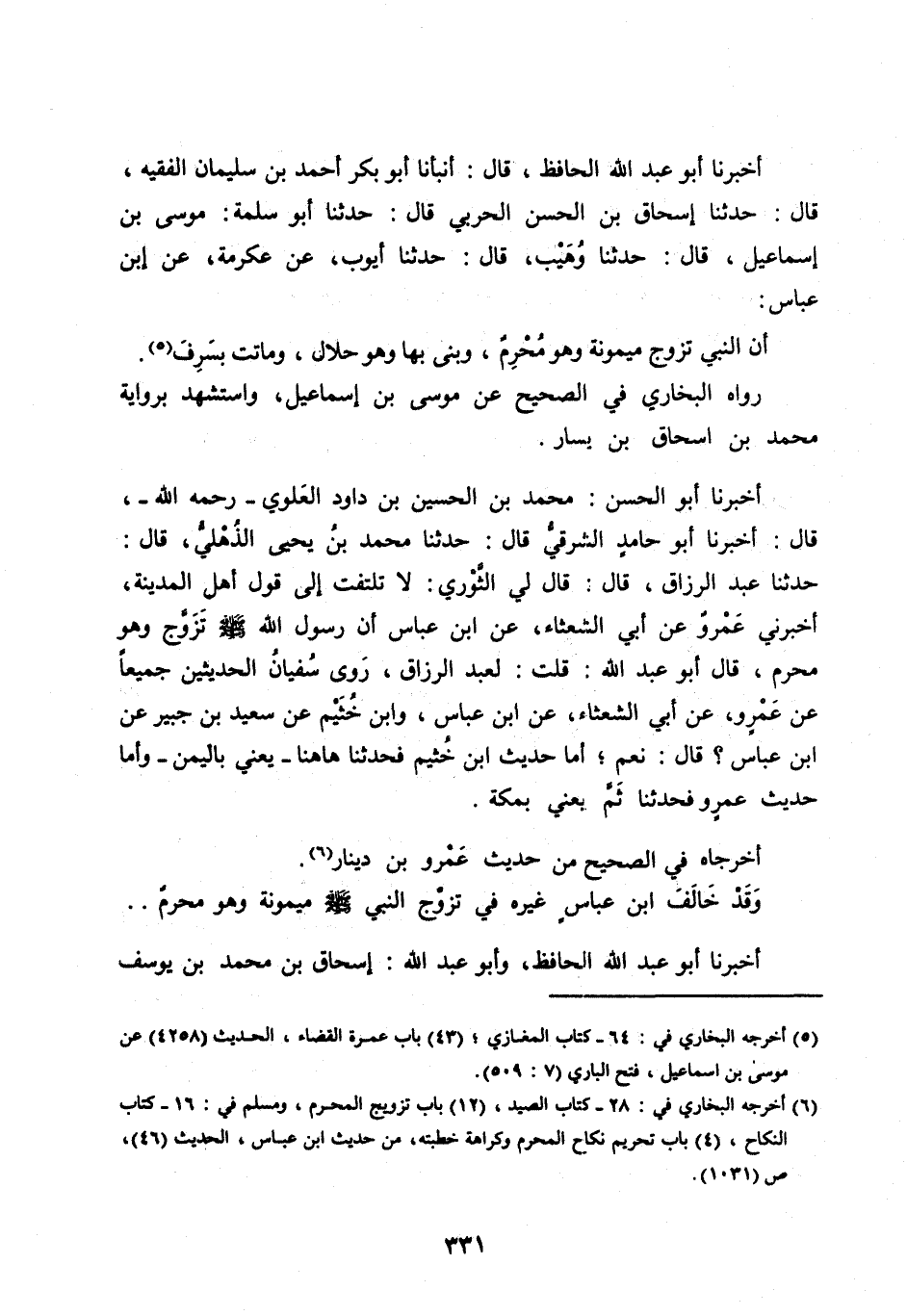 [ (6) ] أخرجه البخاري في: 28- كتاب الصيد، (12) باب تزويج المحرم، ومسلم في: 16- كتاب النكاح، (4) باب تحريم نكاح المحرم وكراهة خطبته، من حديث ابن عباس، الحديث (46) ، ص (1031) .