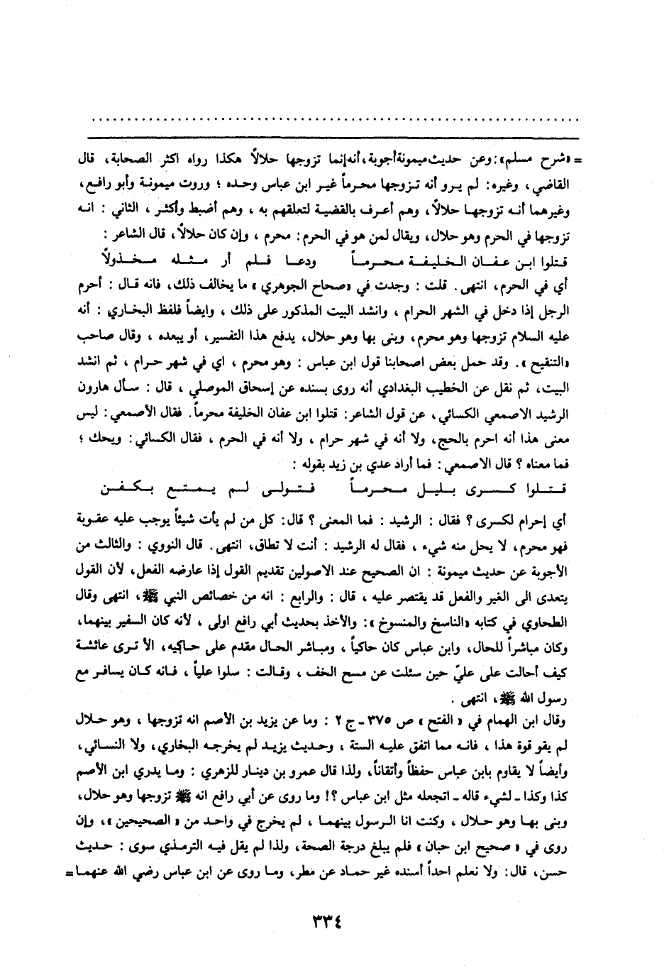 أي إحرام لكسرى؟ فقال: الرشيد: فما المعنى؟ قال: كل من لم يأت شيئا يوجب عليه عقوبة فهو محرم، لا يحل منه شيء، فقال له الرشيد: أنت لا تطاق، انتهى. قال النووي: والثالث من الأجوبة عن حديث ميمونة: ان الصحيح عند الأصوليين تقديم القول إذا عارضه الفعل، لأن القول يتعدى الى الغير والفعل قد يقتصر عليه، قال: والرابع: انه من خصائص النبي صلى الله عليه وسلّم، انتهى وقال الطحاوي في كتابه «الناسخ والمنسوخ» : والأخذ بحديث أبي رافع اولى، لأنه كان السفير بينهما، وكان مباشرا للحال، وابن عباس كان حاكيا، ومباشر الحال مقدم على حاكيه، ألا ترى عائشة كيف أحالت على عليّ حين سئلت عن مسح الخف، وقالت: سلوا عليا، فانه كان يسافر مع رسول الله صلى الله عليه وسلّم، انتهى.